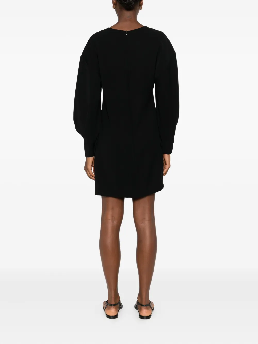 Черный круглый вырез, рукава три четверти, прямой подол, потайная застежка-молния.