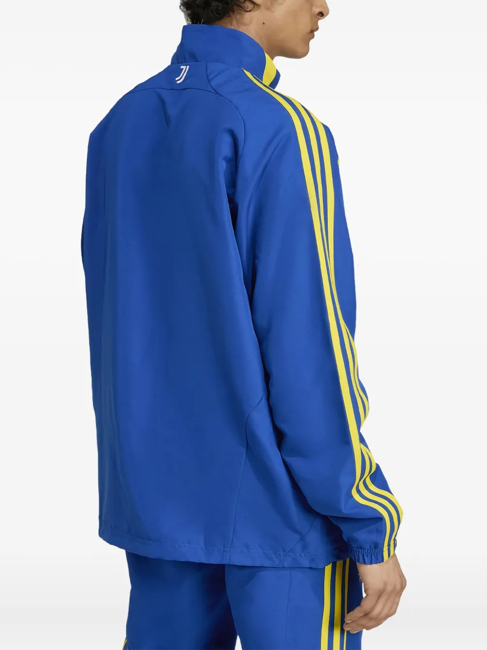 Детали с синими полосками, застежка-молния, высокий воротник, логотип.