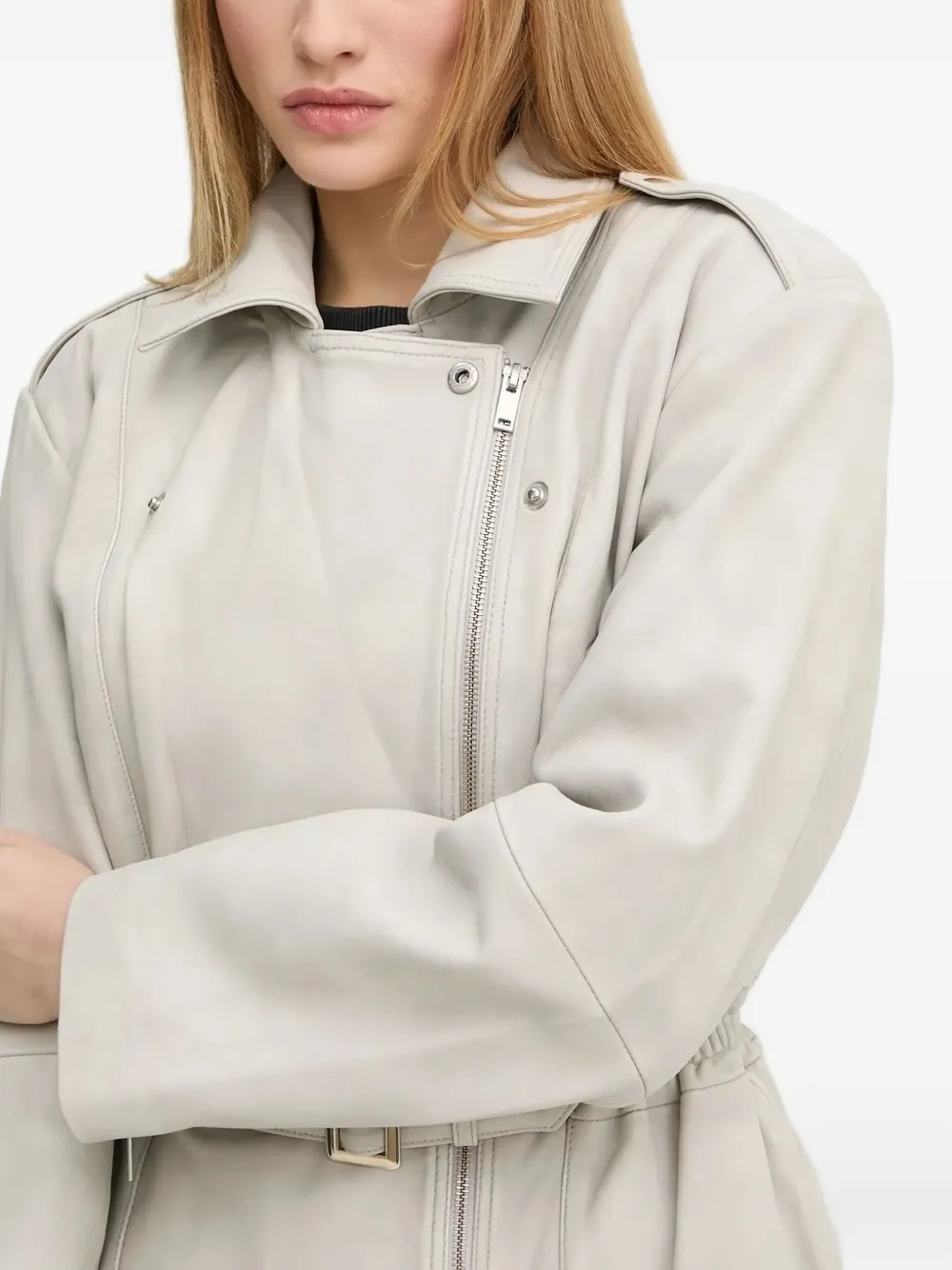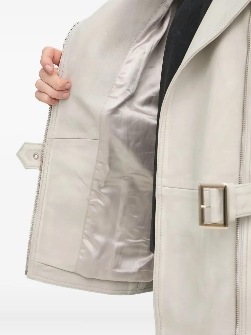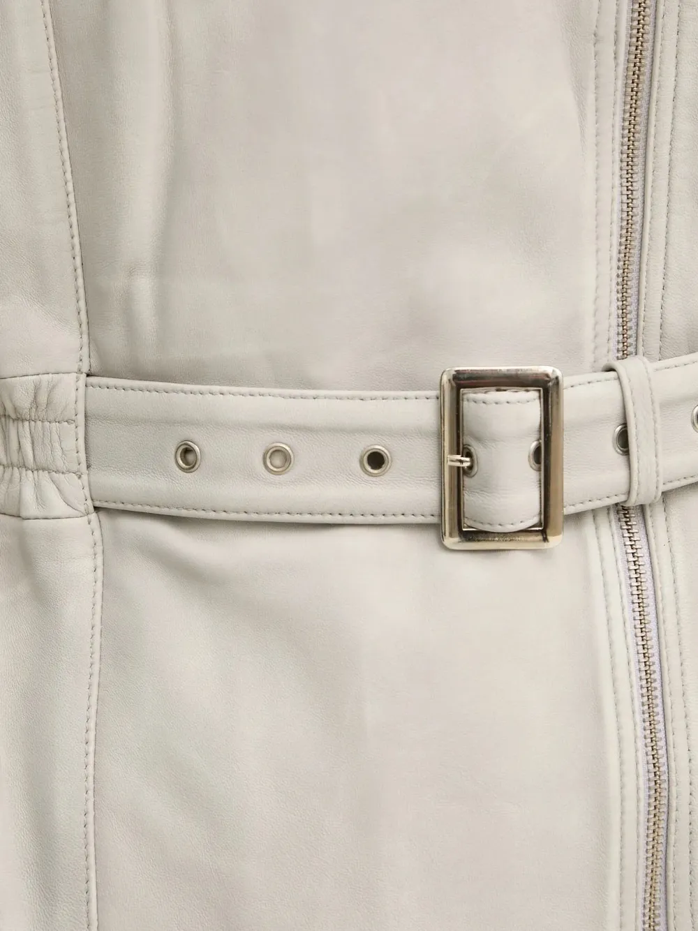 Застежка-молния спереди из светло-серой кожи, пояс на талии, асимметричная молния.