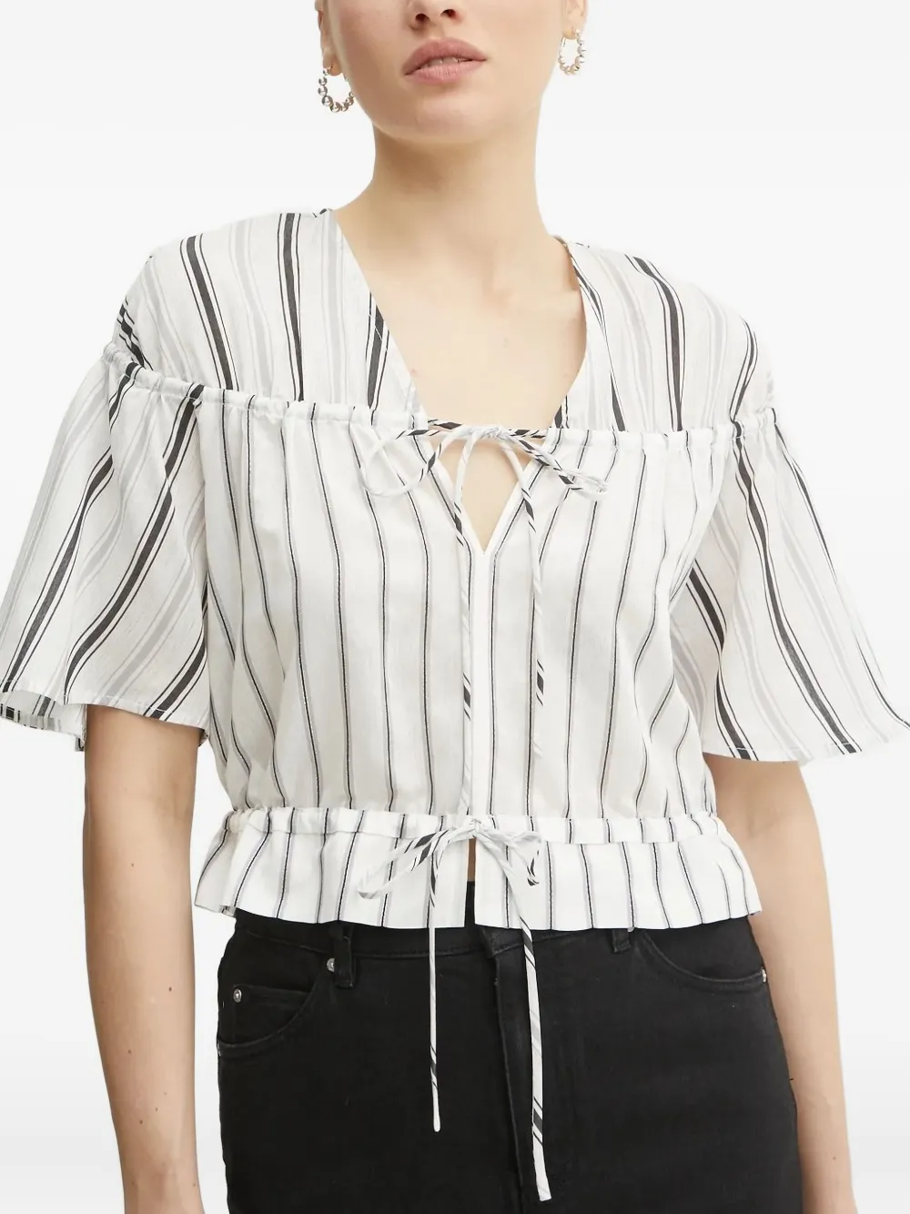 Беловато-черные полосы, завязка на шее, короткие рукава, завязка, V-образный вырез