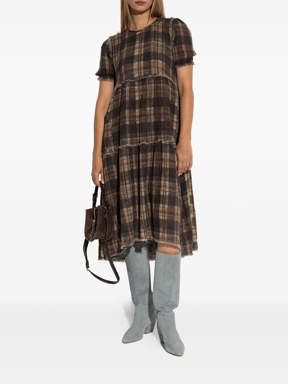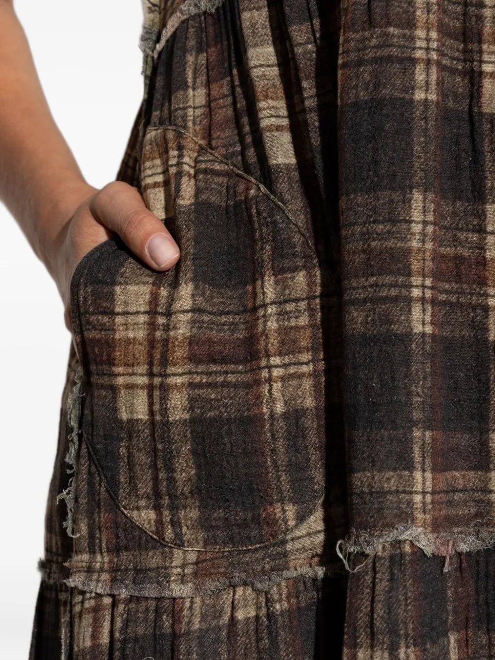 Коричневая клетчатая юбка с рукавами-фонариками, необработанным подолом и накладными карманами.