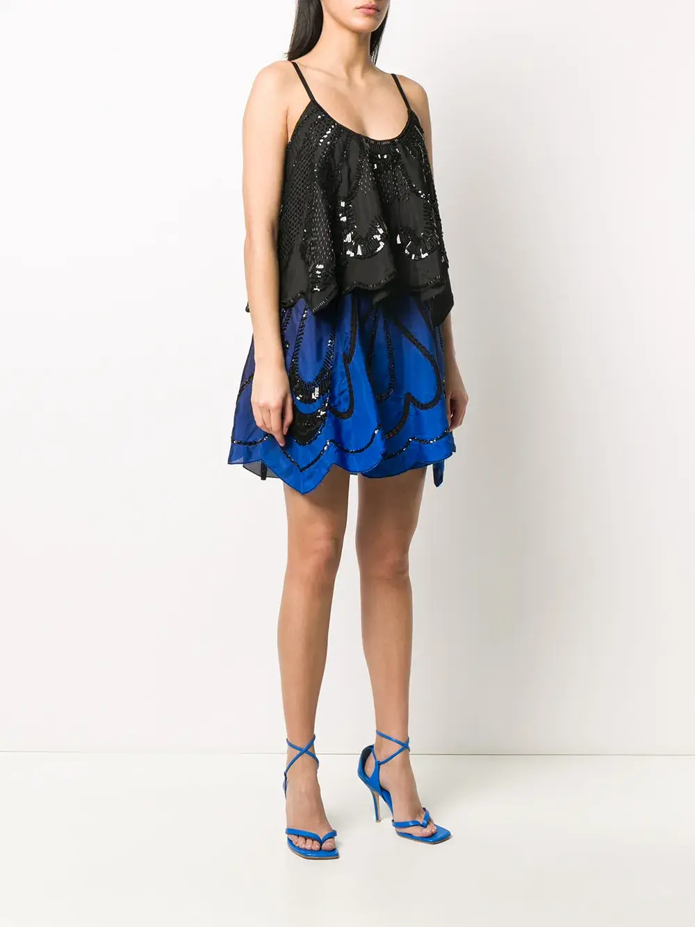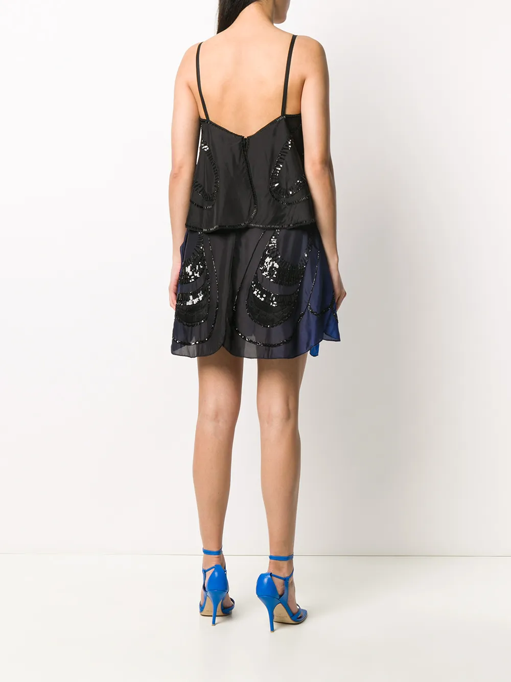 Ярусное декорированное платье миди от Alberta Ferretti. Многослойный дизайн, украшение из пайеток, украшение из бусин, вырез-ковш, тонкие лямки-спагетти, волнистый подол и задняя невидимая застежка на молнию.