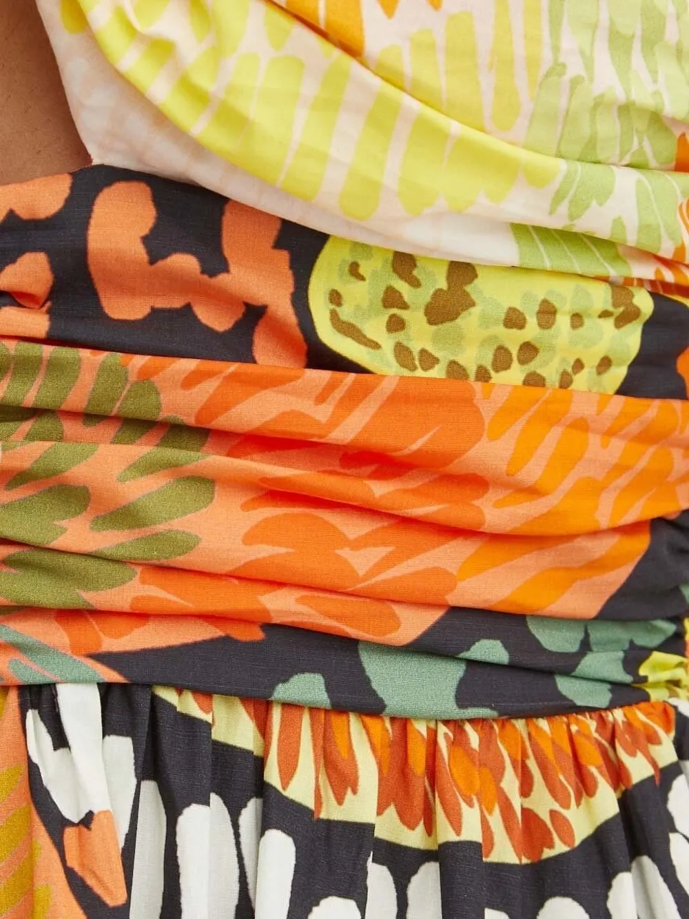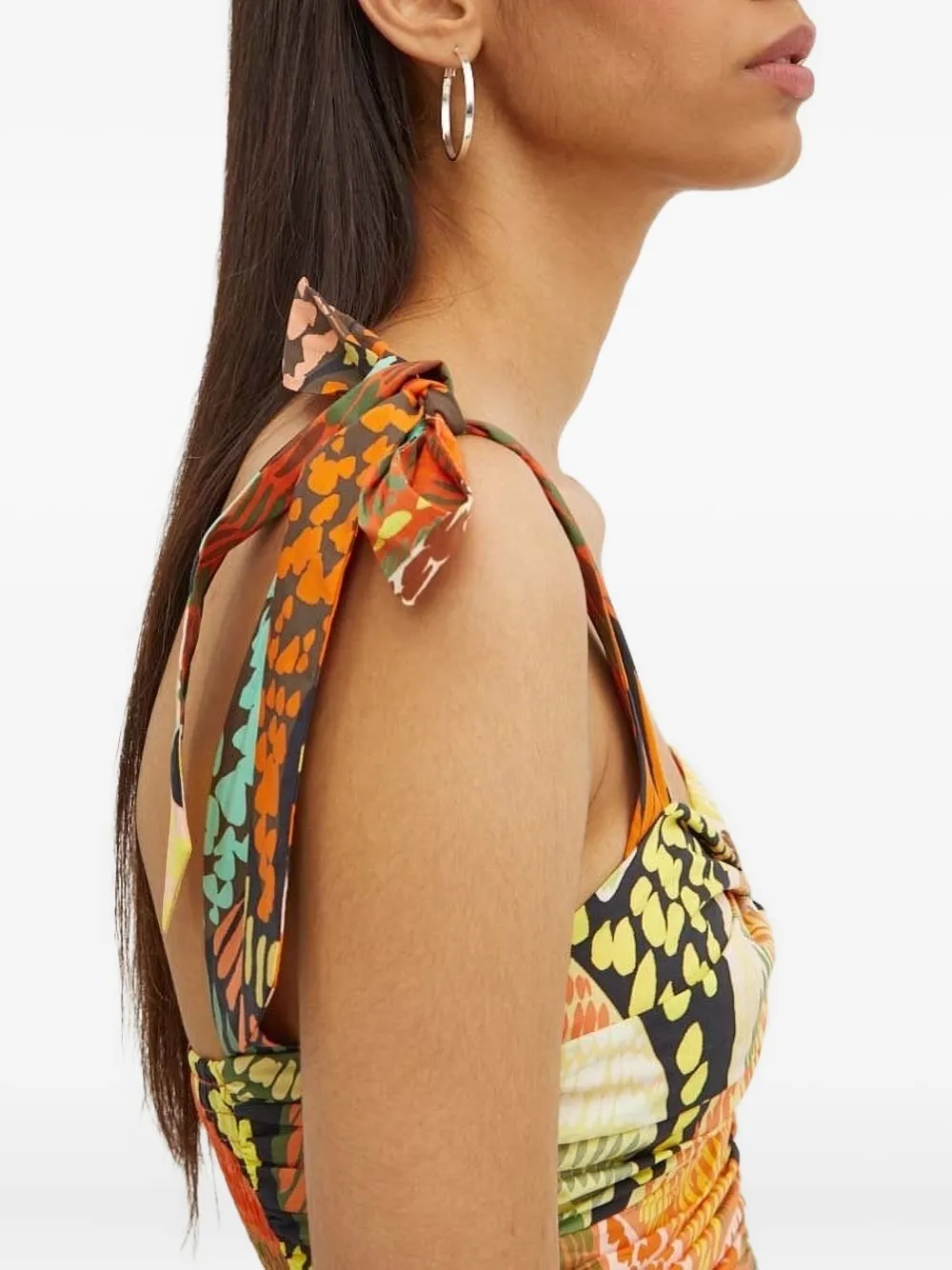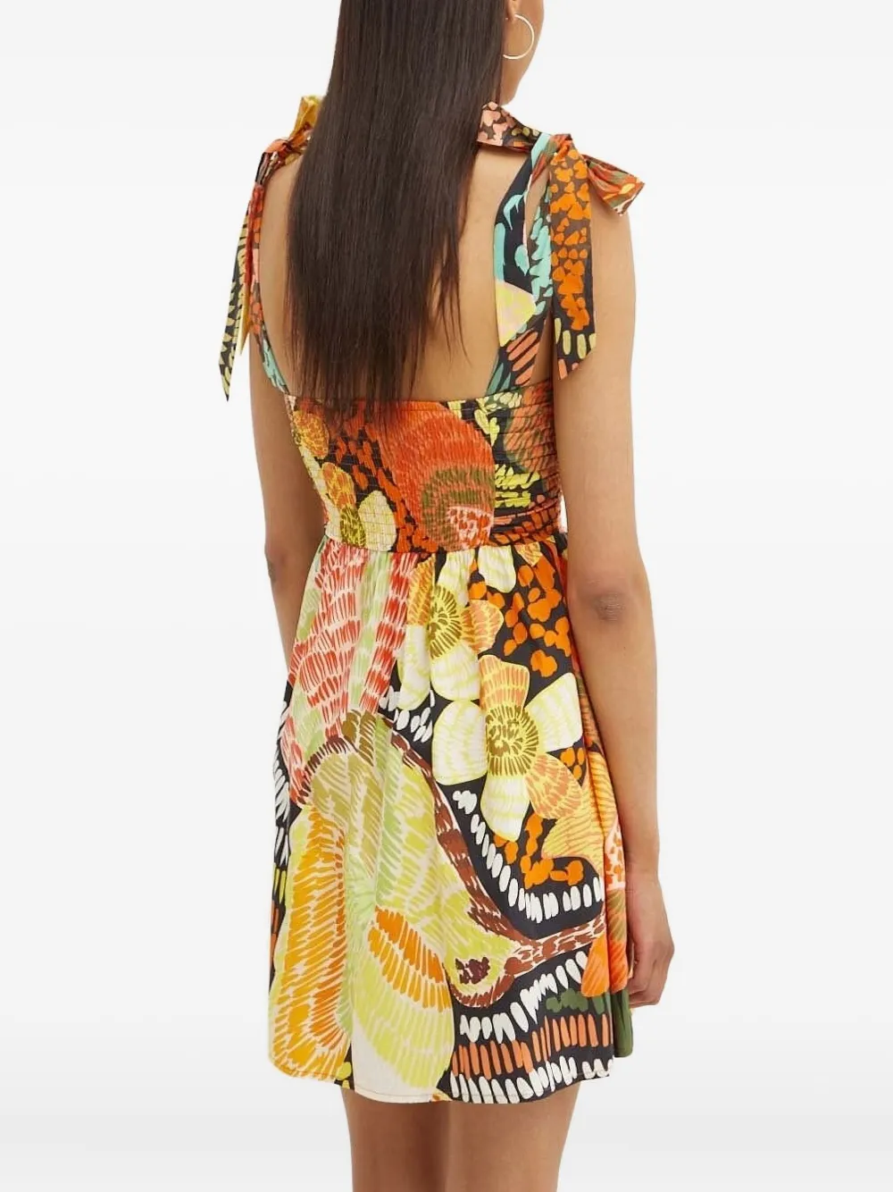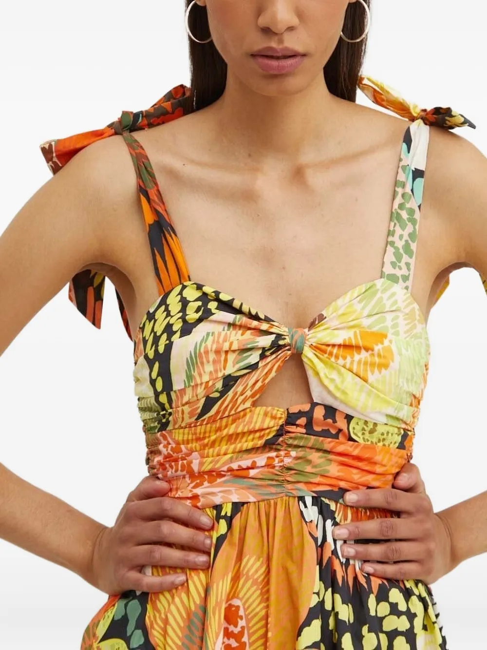 Разноцветный цветочный принт, завязывающиеся бретельки, присборенный лиф, юбка с вырезом-замочной скважиной