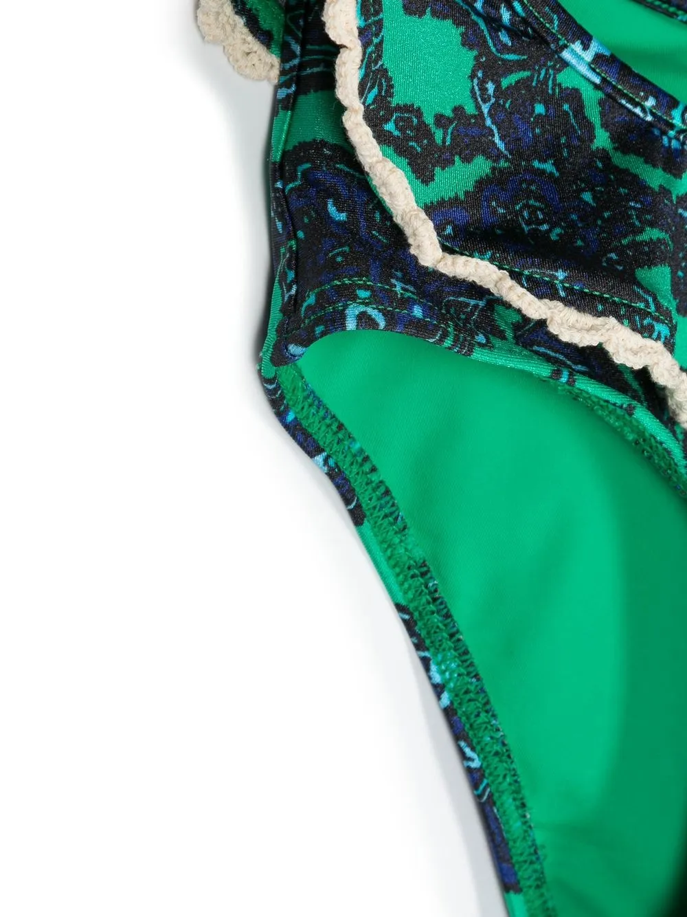 Темно-синий, изумрудно-зеленый, эластичный материал, принт пейсли, вставки с оборками, отделка в технике кроше, U-образный вырез, регулируемые лямки, эластичный пояс и модель без застежки. Пожалуйста, примеряйте купальники и пляжные шорты только поверх собственного белья.
