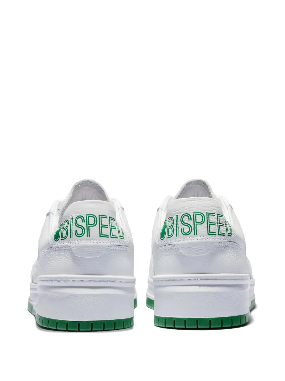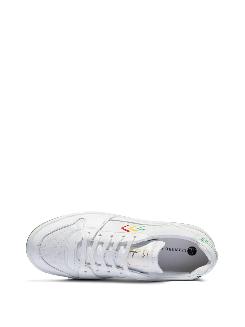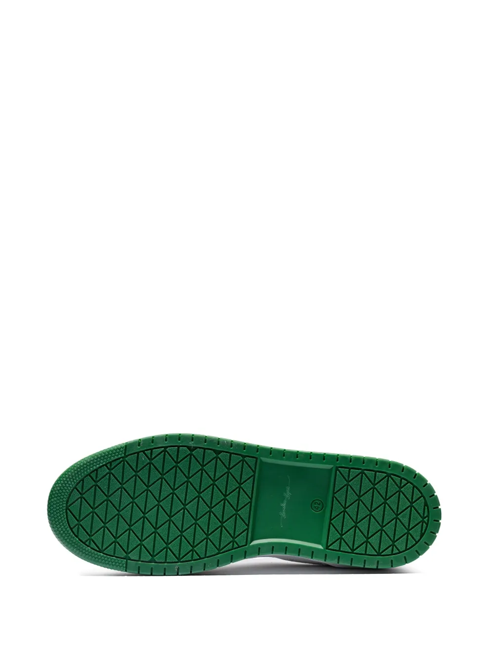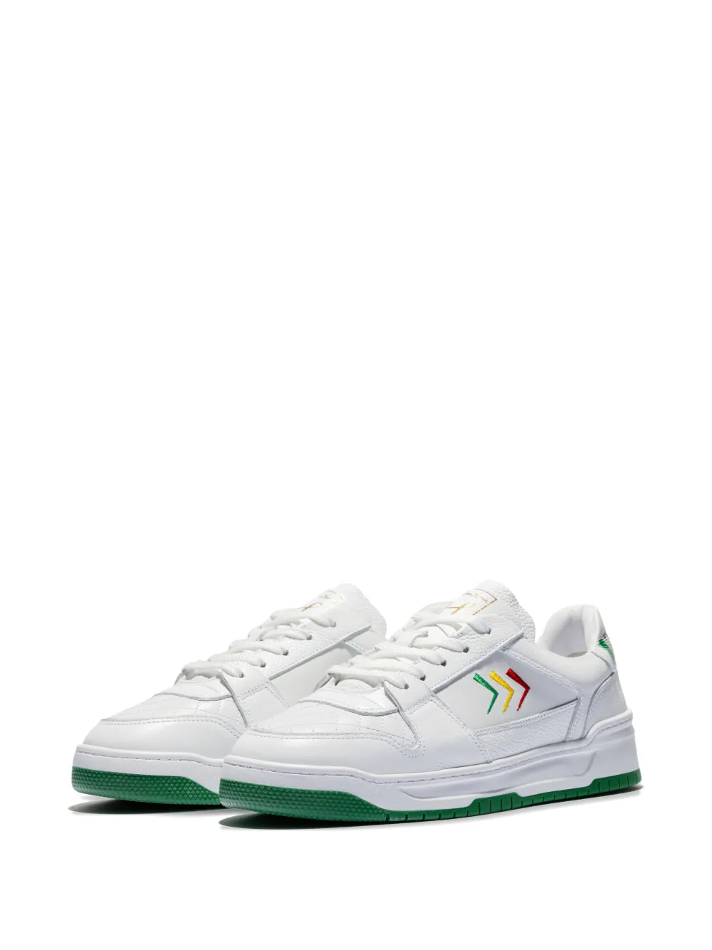 Верх из белой кожи, зеленая подошва, вышитая стрела, тисненая надпись, мягкий язычок