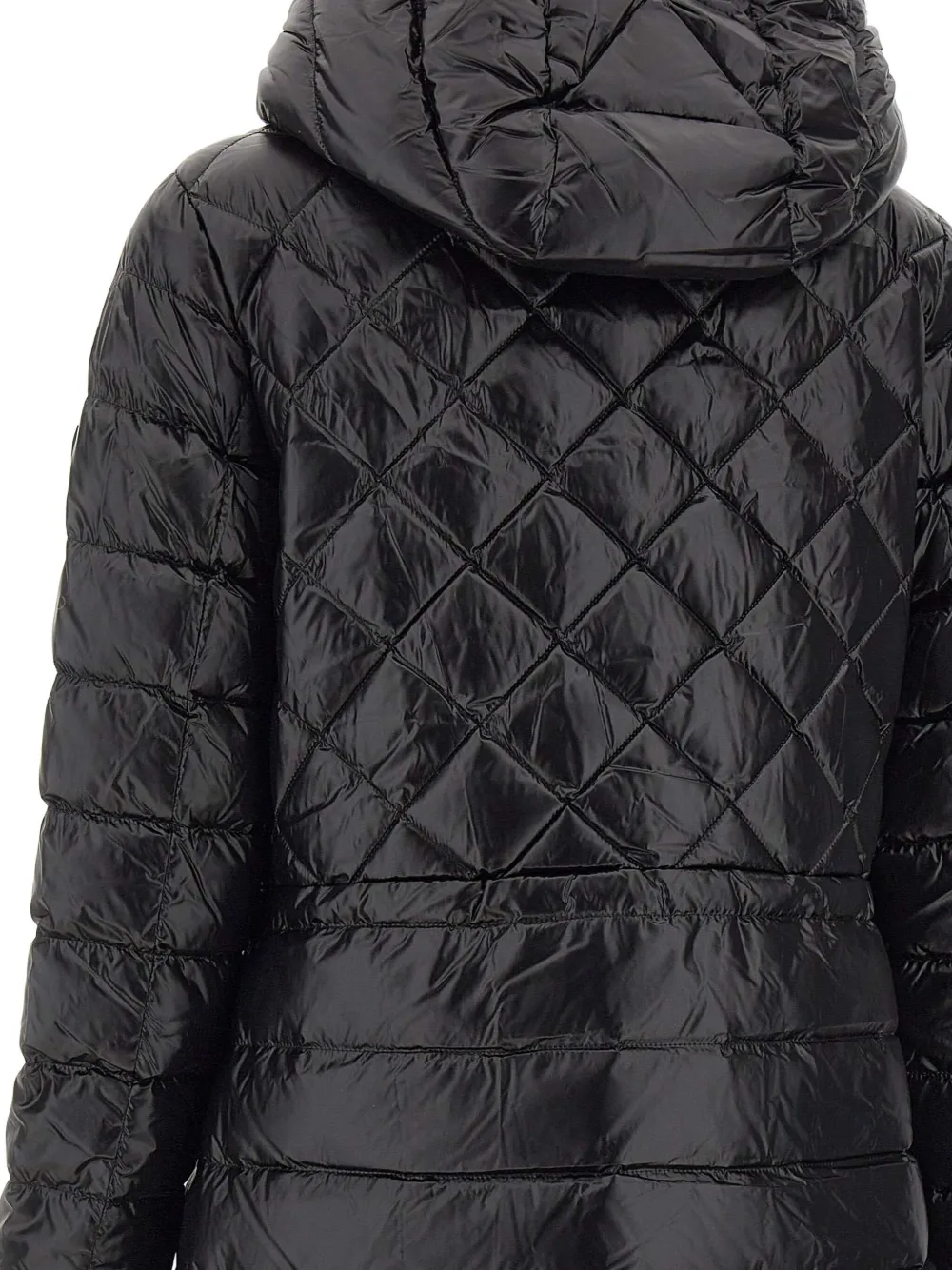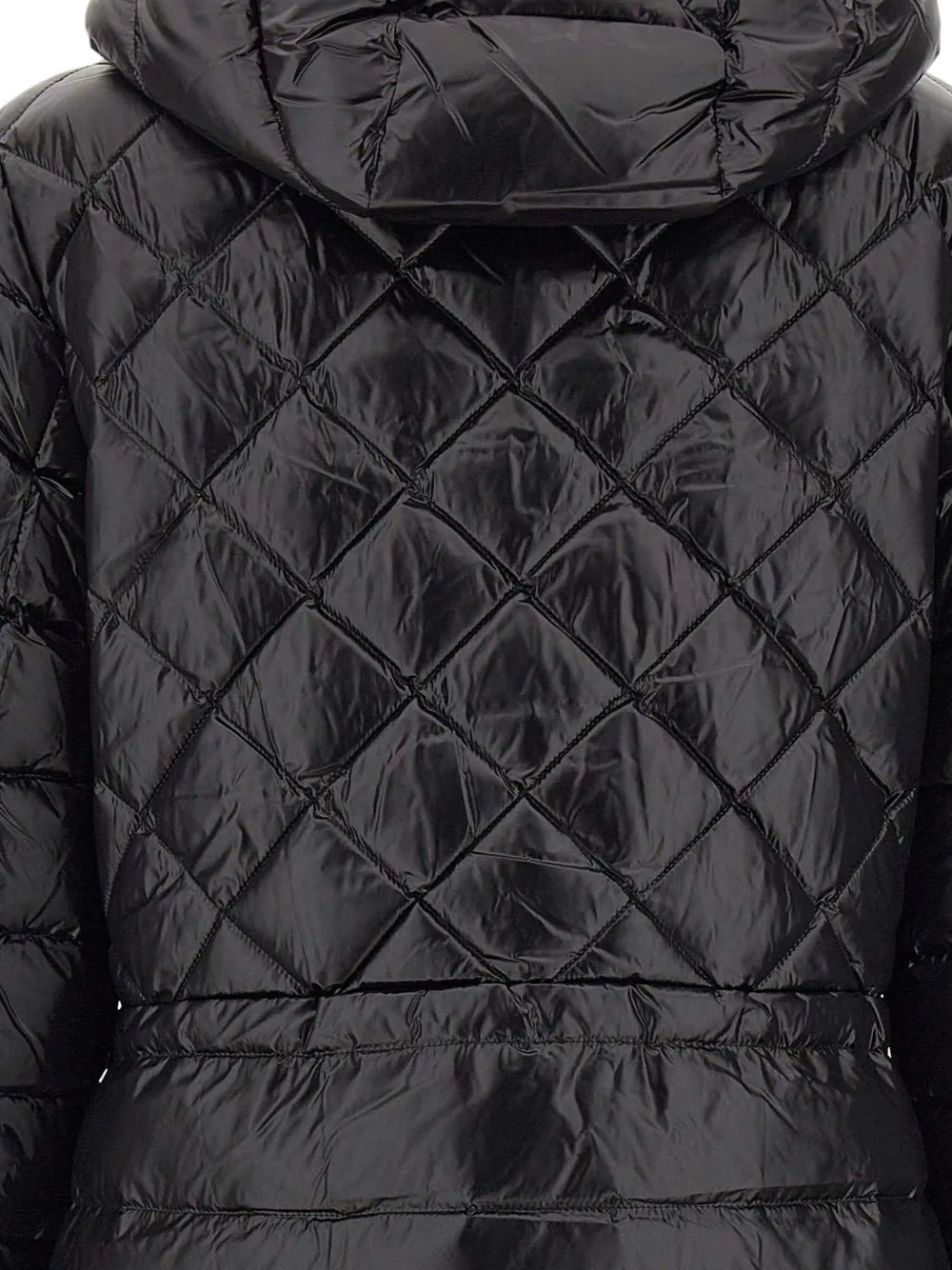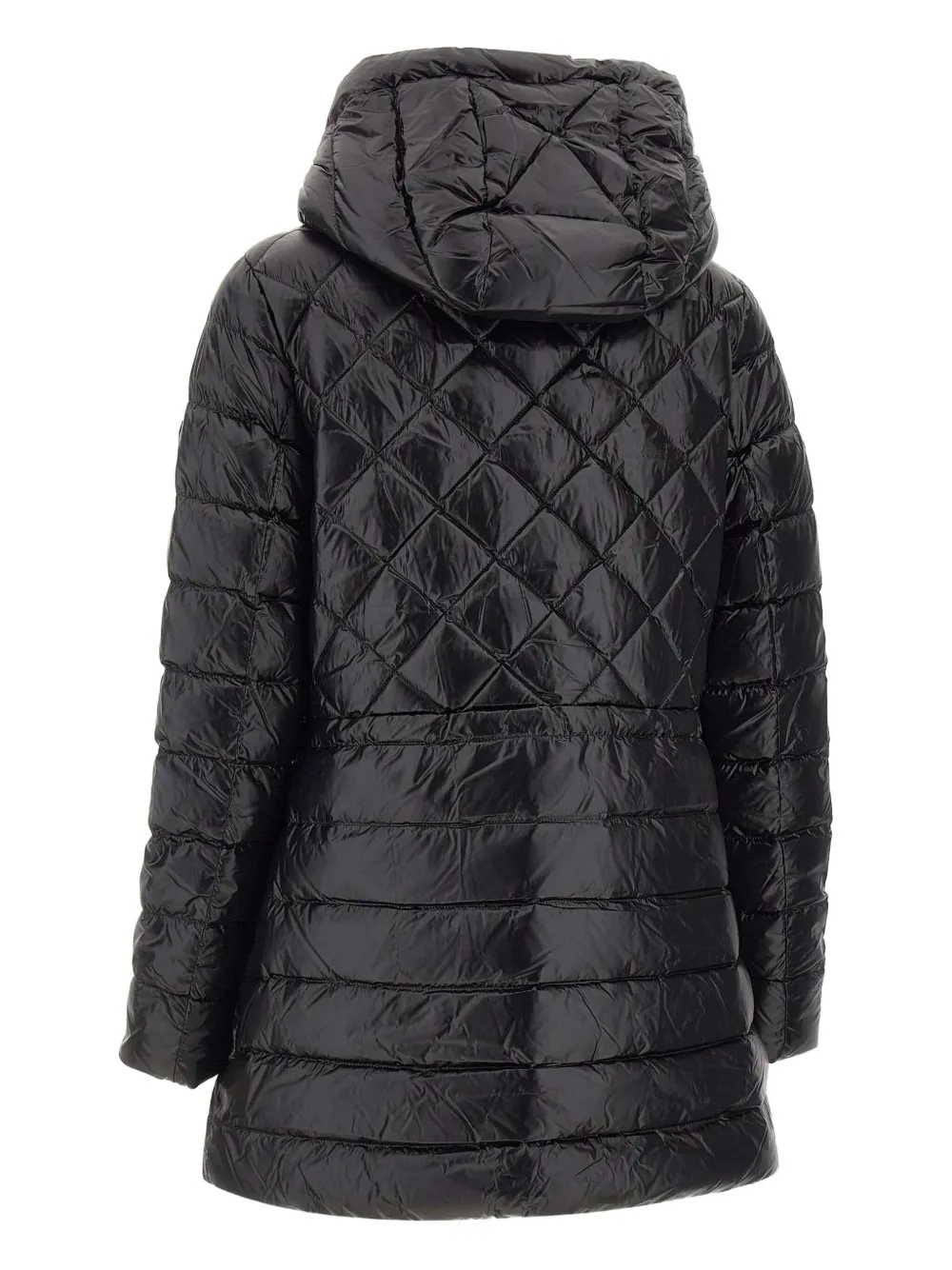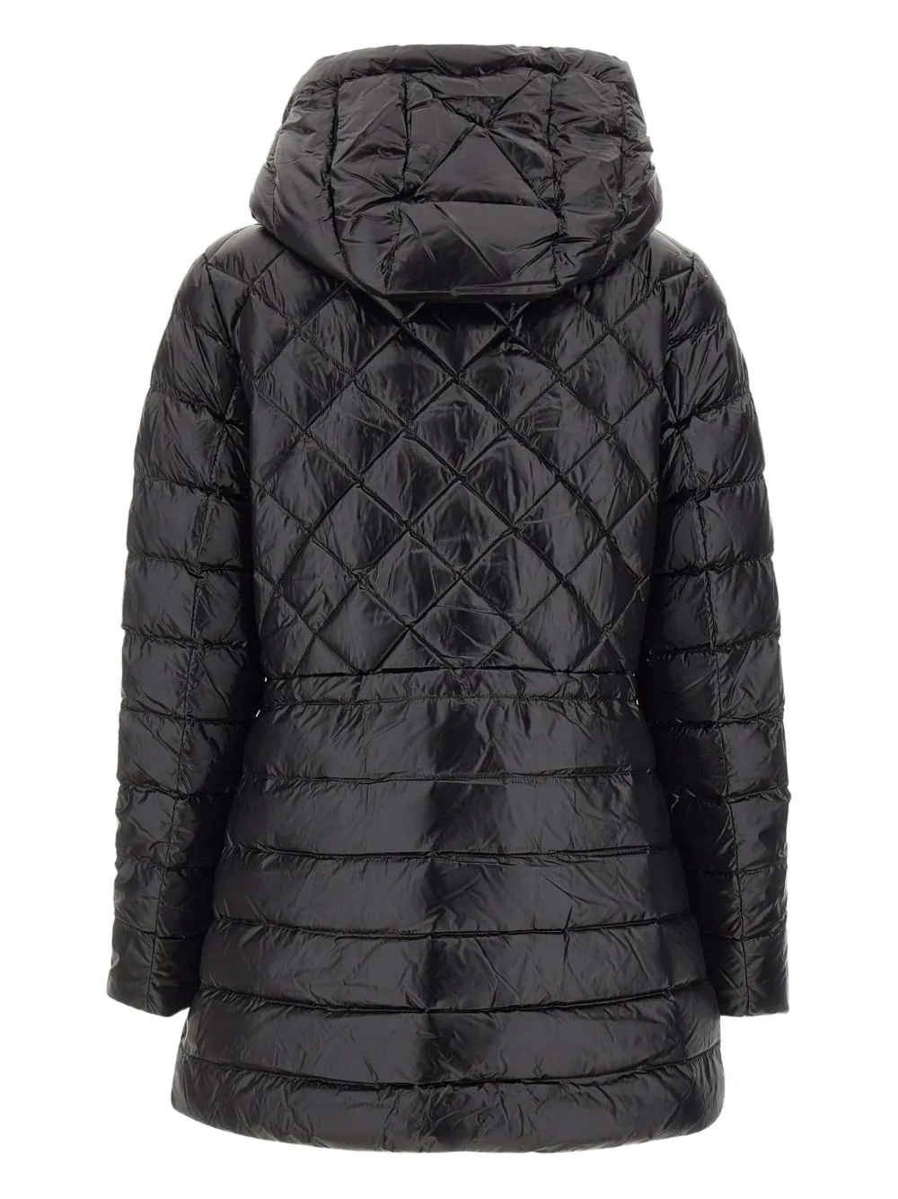 Черная ромбовидная простежка, фиксированный капюшон, двухсторонняя застежка-молния, кулиска на талии, карманы на молнии спереди