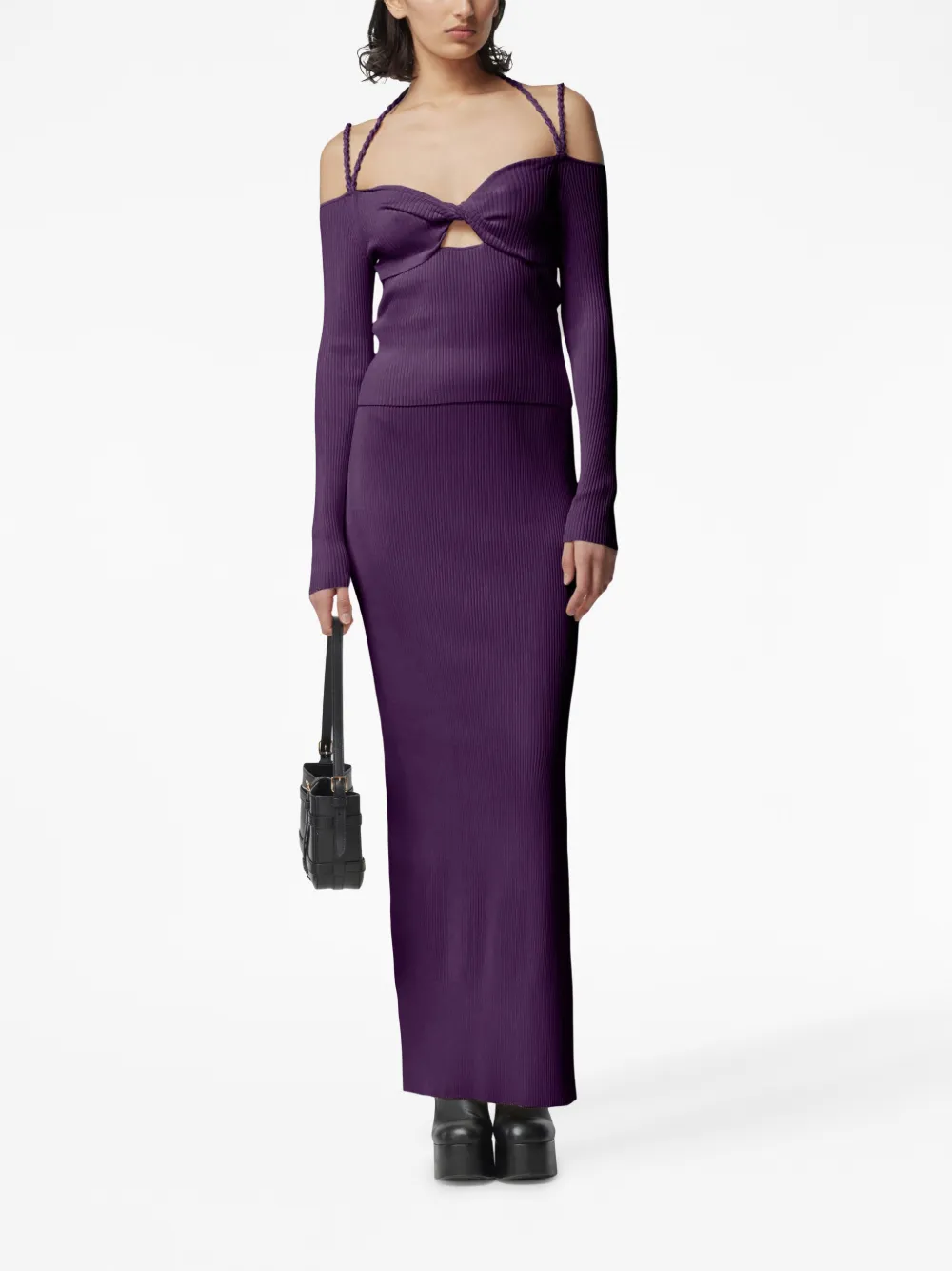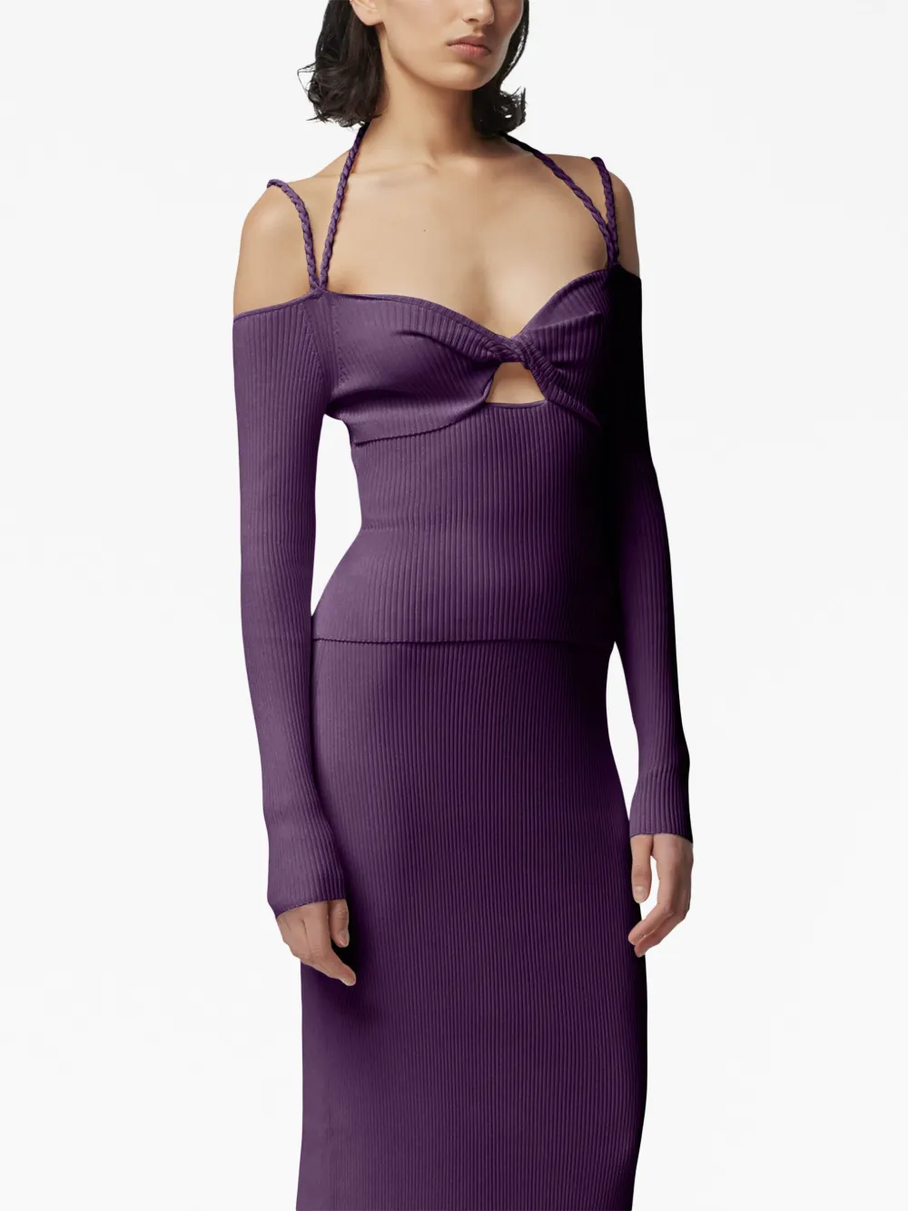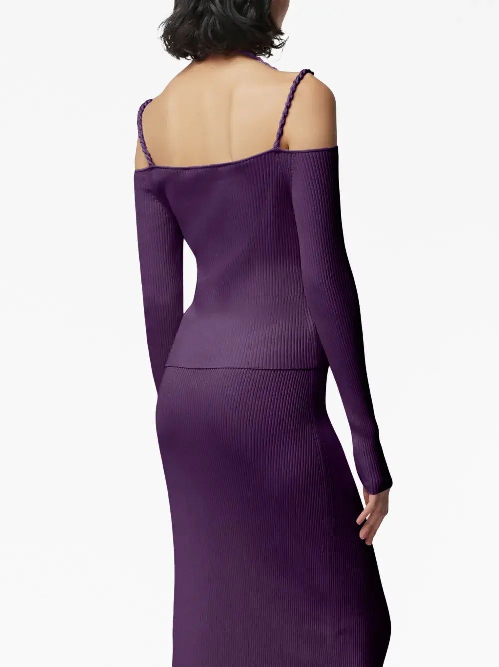 Аметистовый, трикотаж в рубчик, бралетт, вырезные детали, вырез-петля халтер, вырез в форме сердца, квадратный вырез на спине, тонкие бретели, рукава с открытыми плечами, длинные рукава и прямой подол.