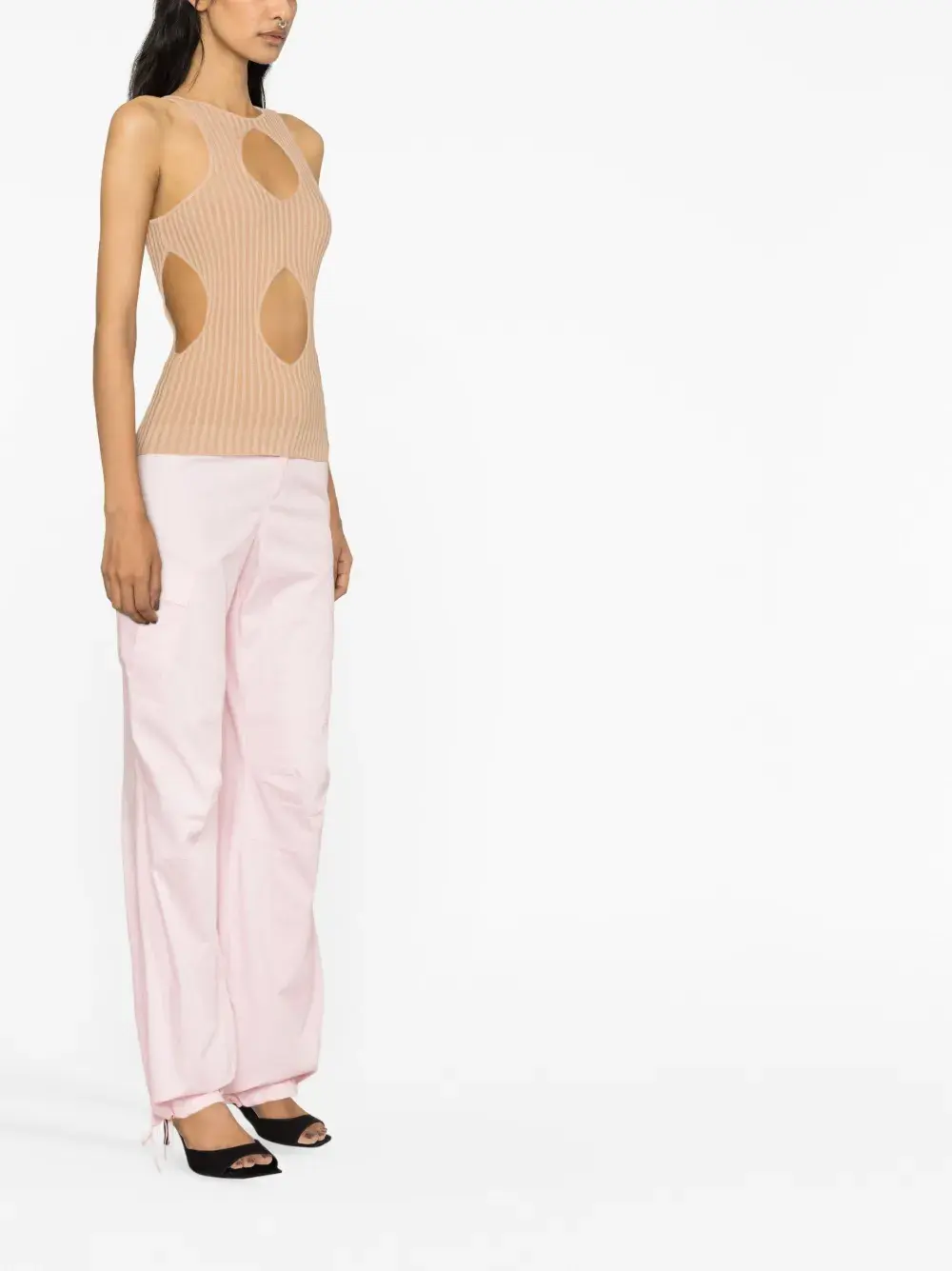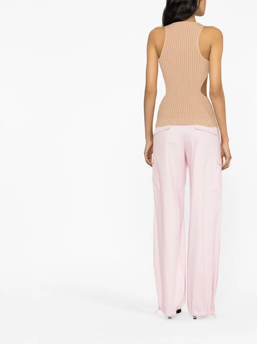 Светло-бежевый, трикотаж в рубчик, вырезные детали, круглый вырез и без рукавов.