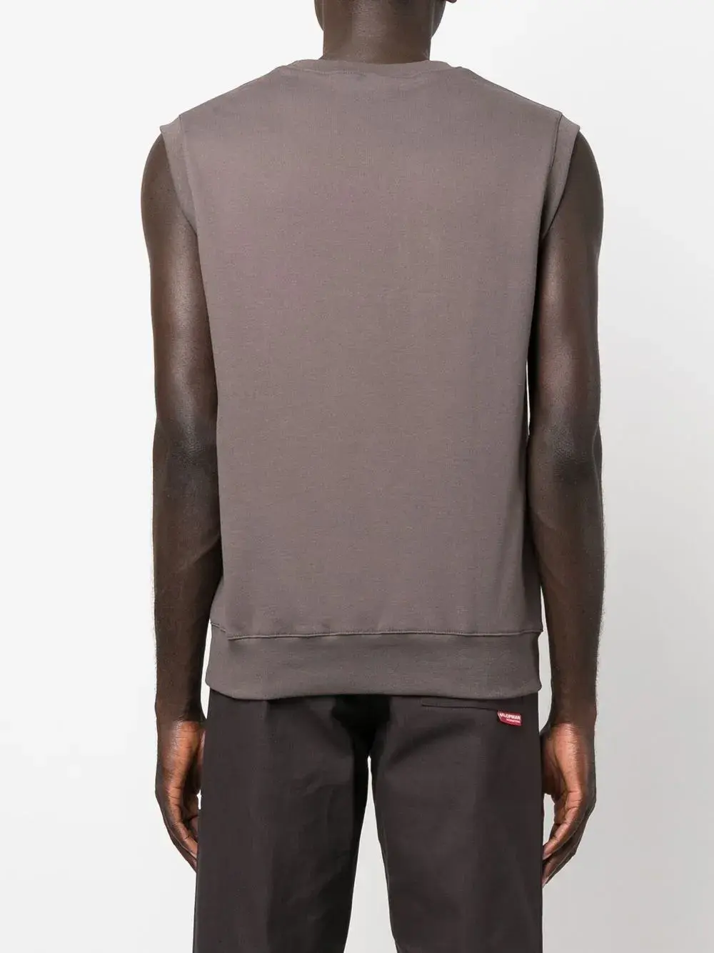 Темно-серый, нашивка, флисовый материал, круглый вырез, без рукавов и прямой подол. Это унисекс-модель. Обратите внимание, что для нее используется мужская размерная сетка.