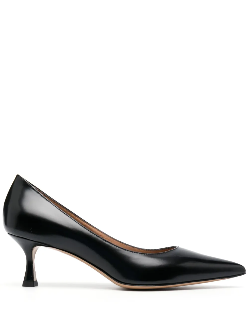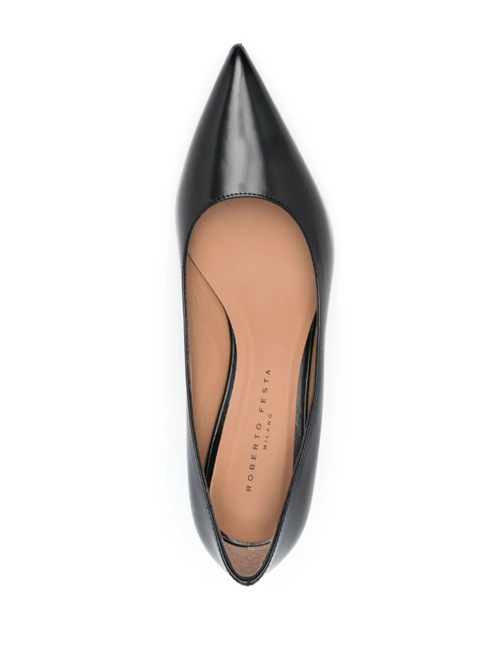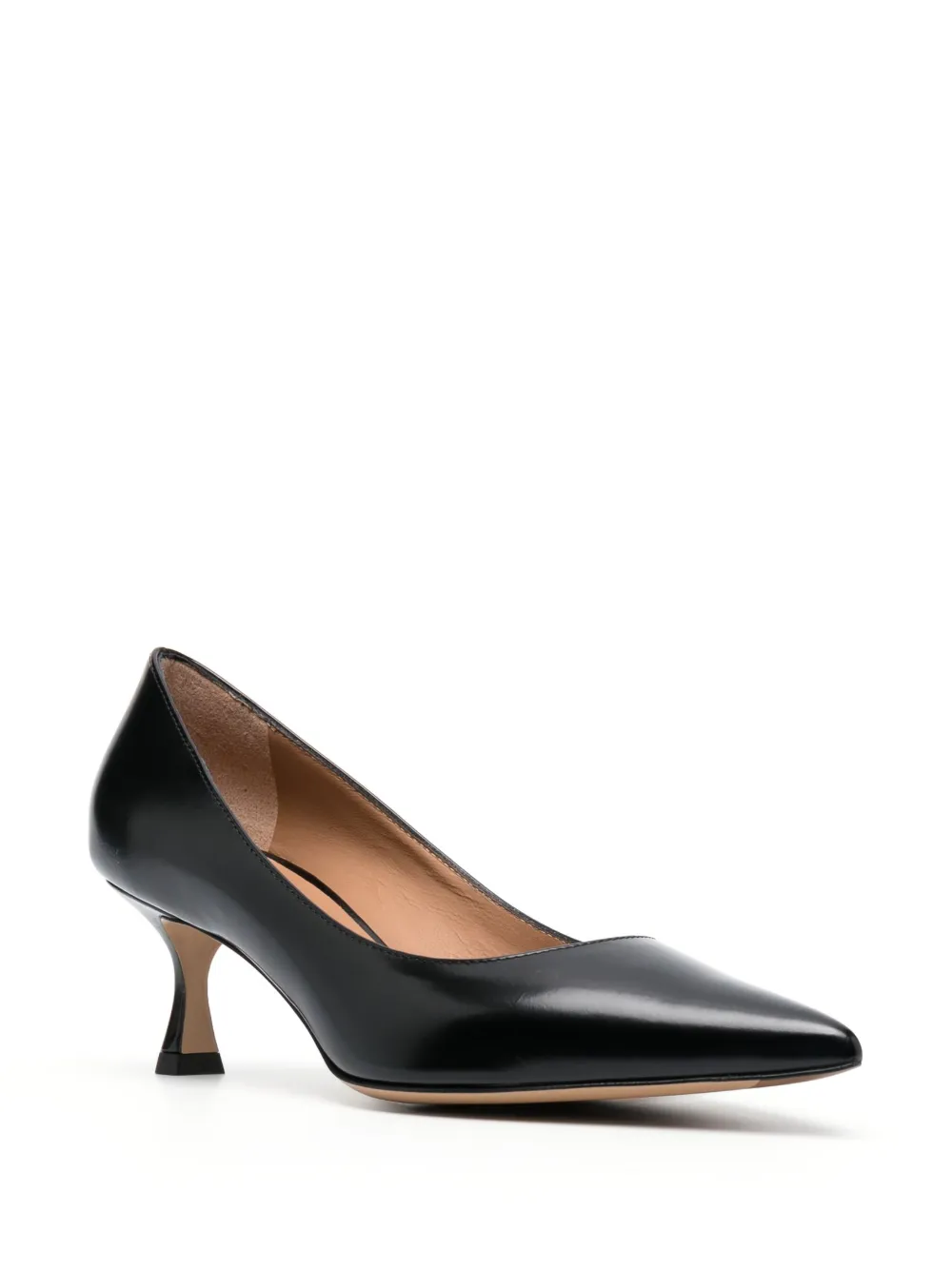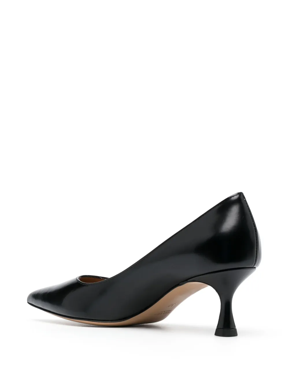 Черный, телячья кожа, гладкая текстура кожи, стелька с логотипом, заостренный носок, модель без застежки и скульптурный каблук средней высоты.