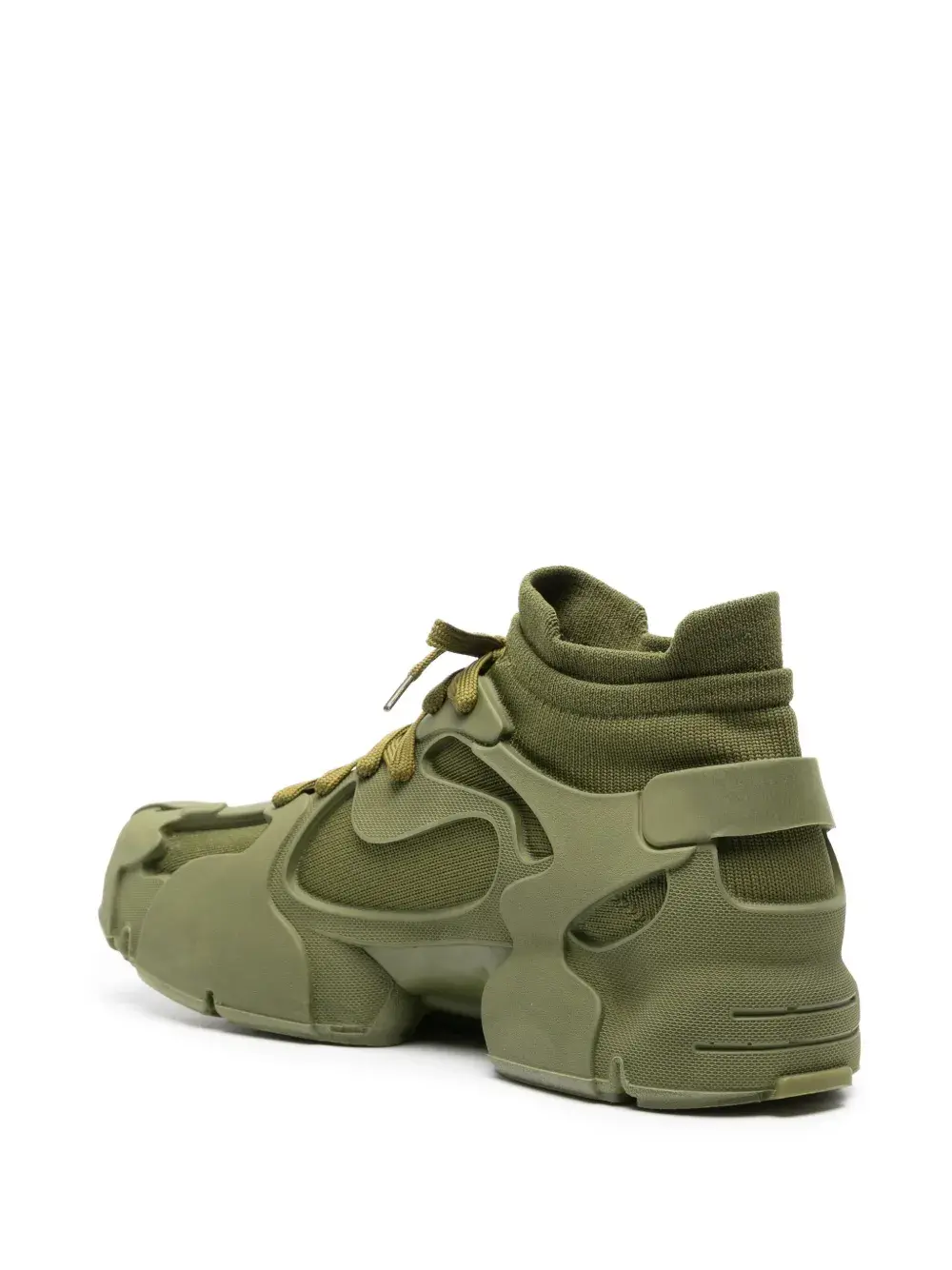 Оливково-зеленый, конструкция с внешним каркасом, однотонная расцветка, материал 3D-knit, водоотталкивающий материал, миндалевидный носок, шнуровка спереди, носочная деталь, стелька с логотипом и массивная подошва.