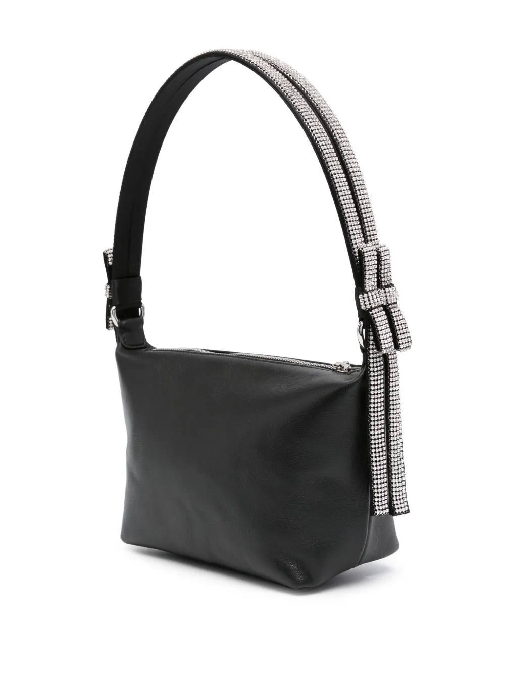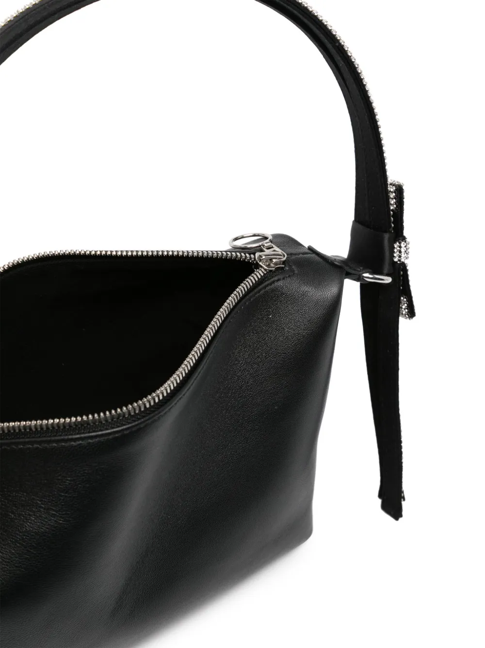 Черный, телячья кожа, бант, декор из кристаллов и основное отделение.
