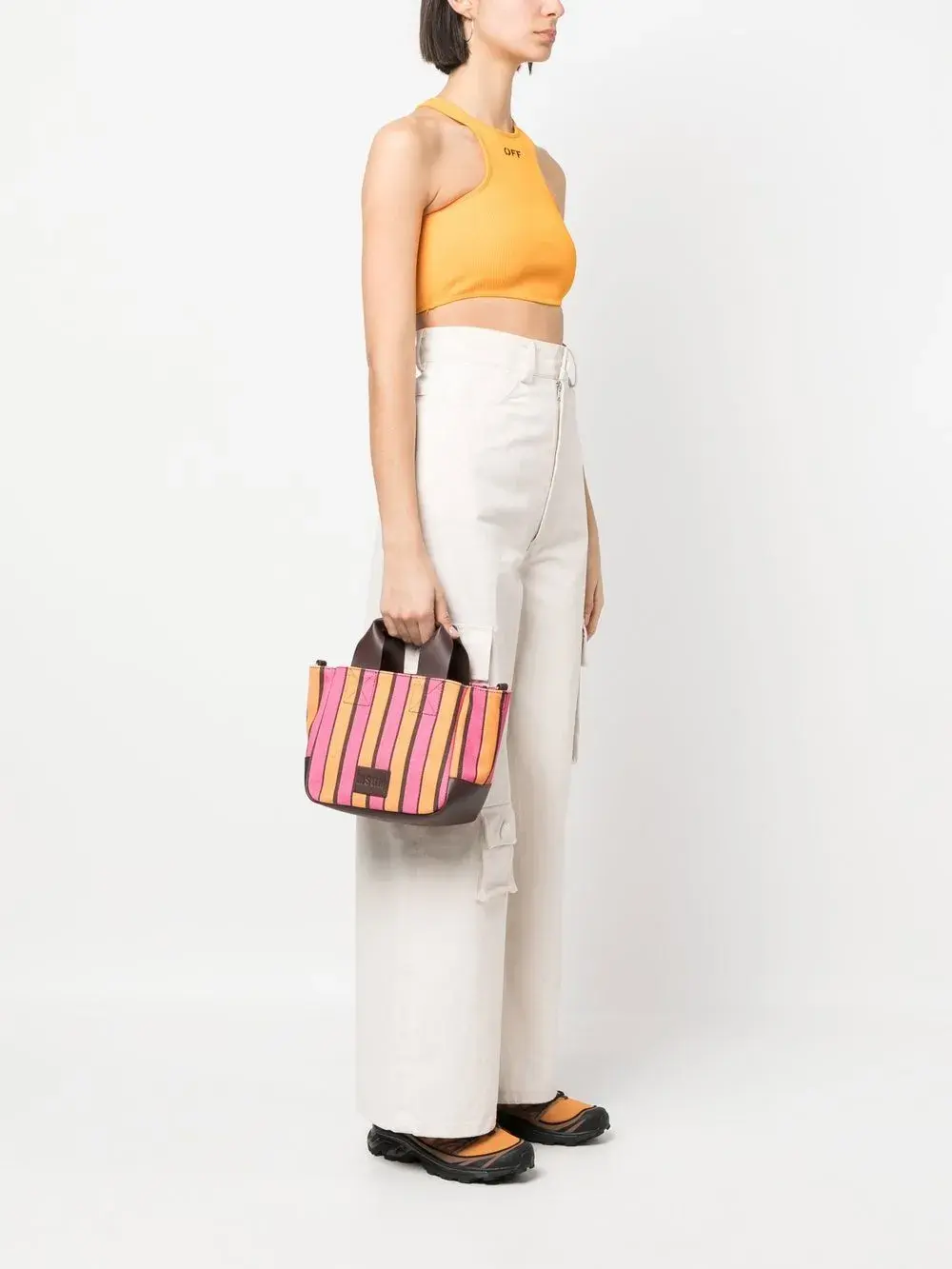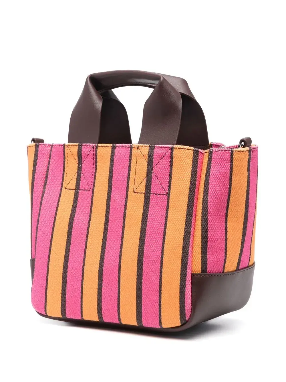 Шоколадный, разноцветный, узор в вертикальную полоску, нашивка с логотипом спереди, дизайн с открытым верхом, съемный ремень на плечо, две верхние ручки и основное отделение.