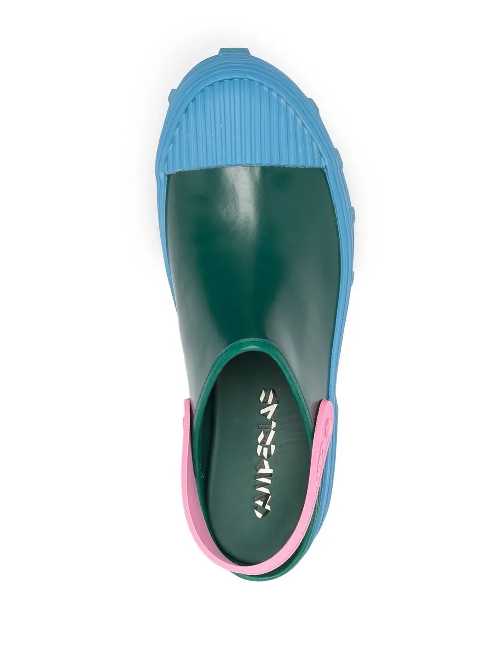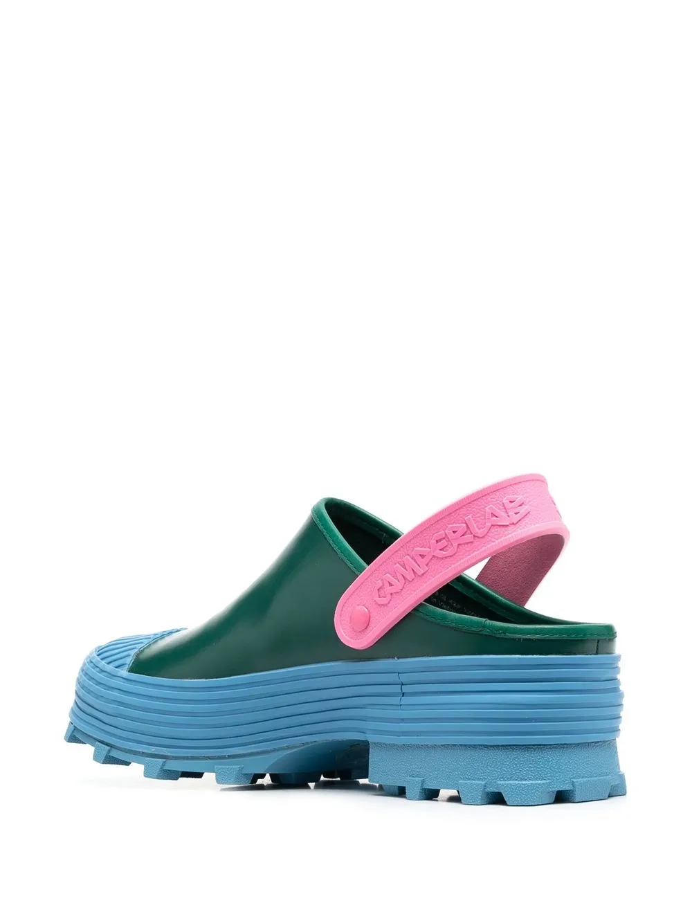 Зеленый, синий, розовый, кожа, смесовый переработанный полиэстер, резиновый носок, дизайн колор-блок, без задника, ремешок на щиколотке, контрастный носок и массивная резиновая подошва.