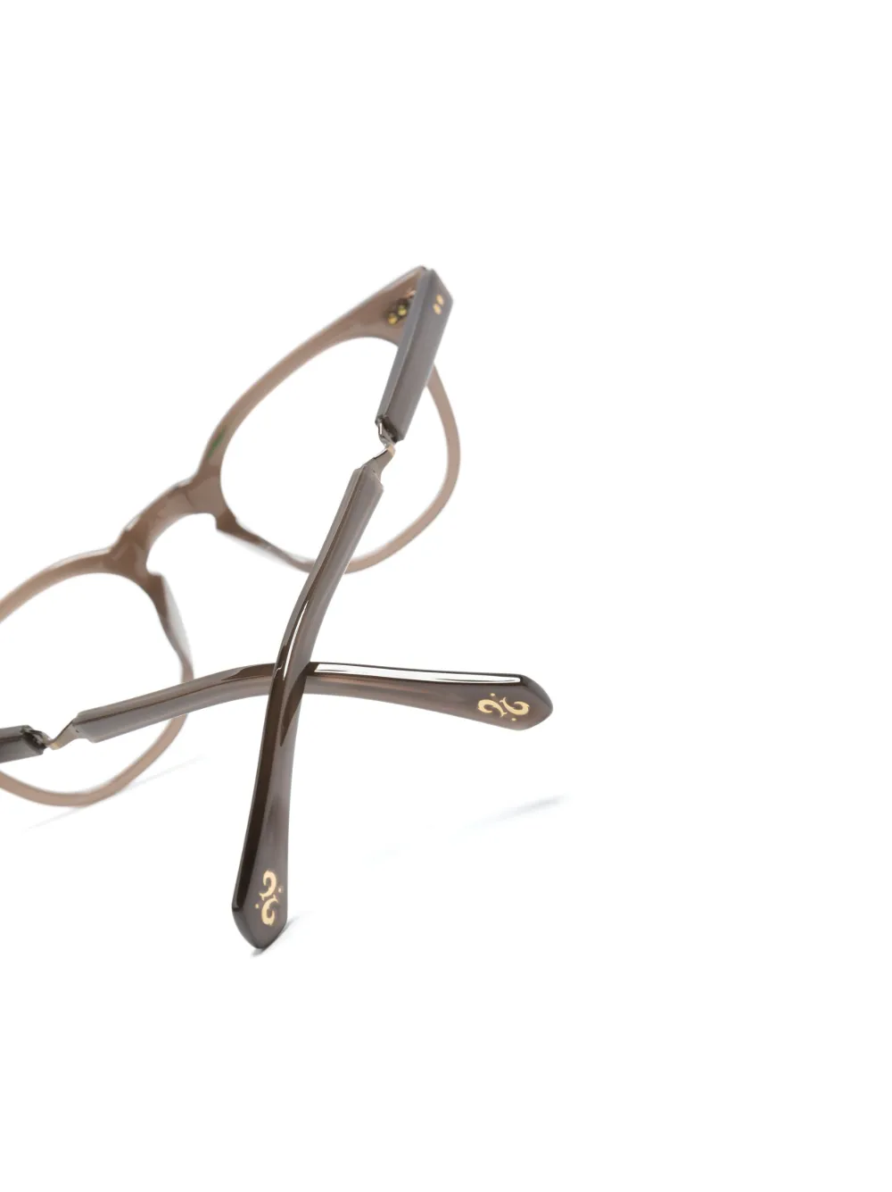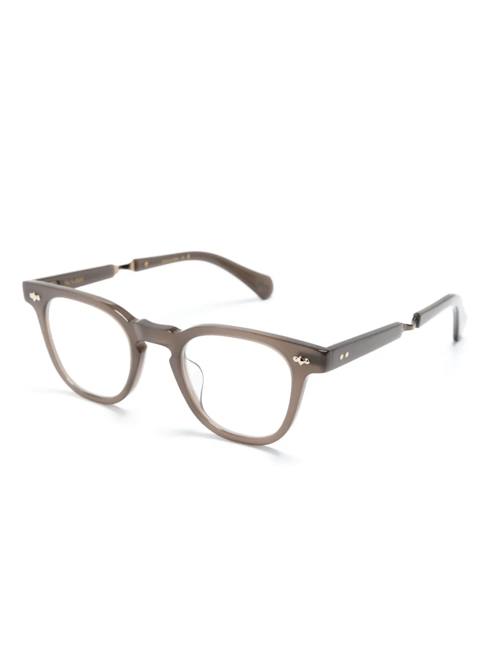 Серо-коричневый, трапециевидная оправа, прозрачные линзы, носоупоры, заклепки, прямые дужки, тисненый логотип на дужке и дужки с закругленными концами. В комплект входит защитный чехол для очков. Обратите внимание, что на FARFETCH продаются оправы с линзами без диоптрий.