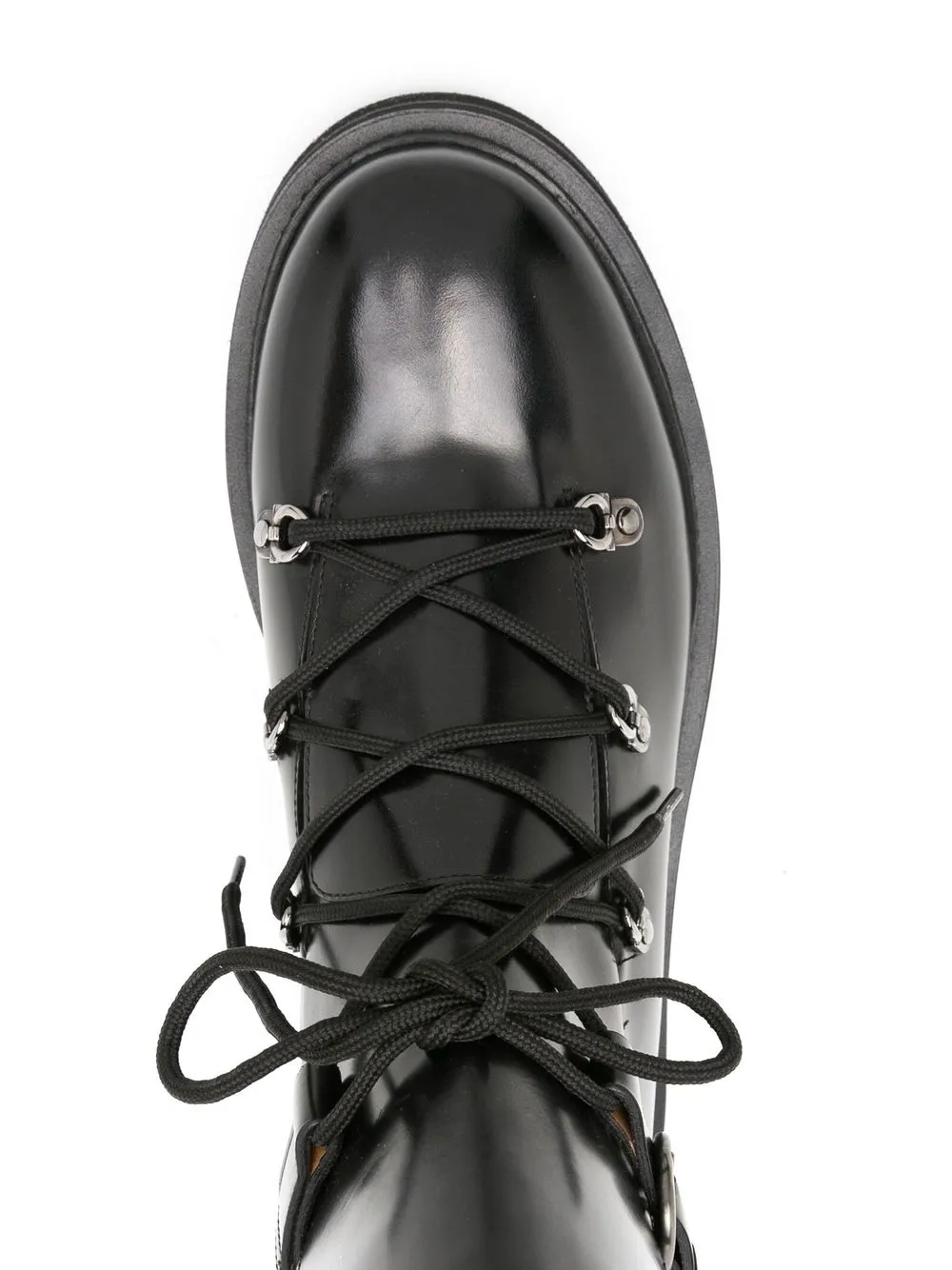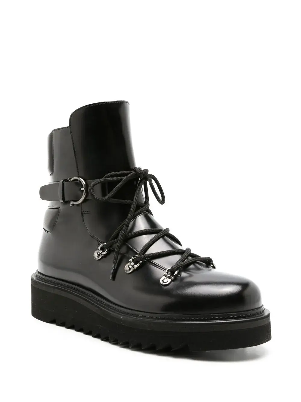 Черный, телячья кожа, серебристая фурнитура, шнуровка, высота по щиколотку, закругленный носок, пряжка Gancini, застежки на молнии сбоку и рифленая резиновая подошва.