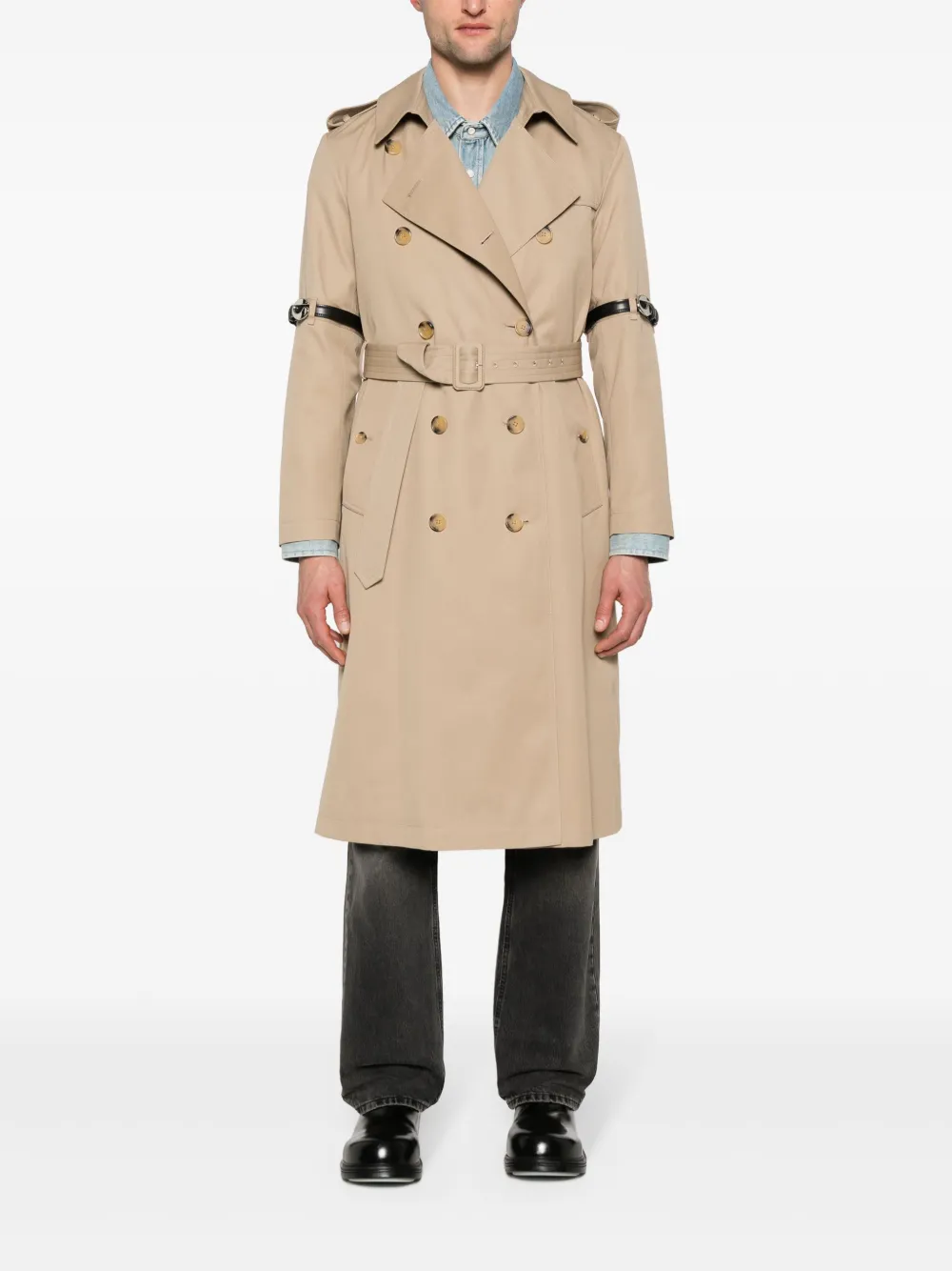 Подробнее о товаре: • бежевый • саржевое переплетение • классический воротник • эполеты • длинные рукава • ремешок на рукавах • два прорезных кармана по бокам • съемный пояс • складки сзади • внутренний накладной карман • цельная подкладка • прямой подол • двубортная застежка на пуговицы • Это унисекс-модель. Обратите внимание, что для нее используется мужская размерная сетка.