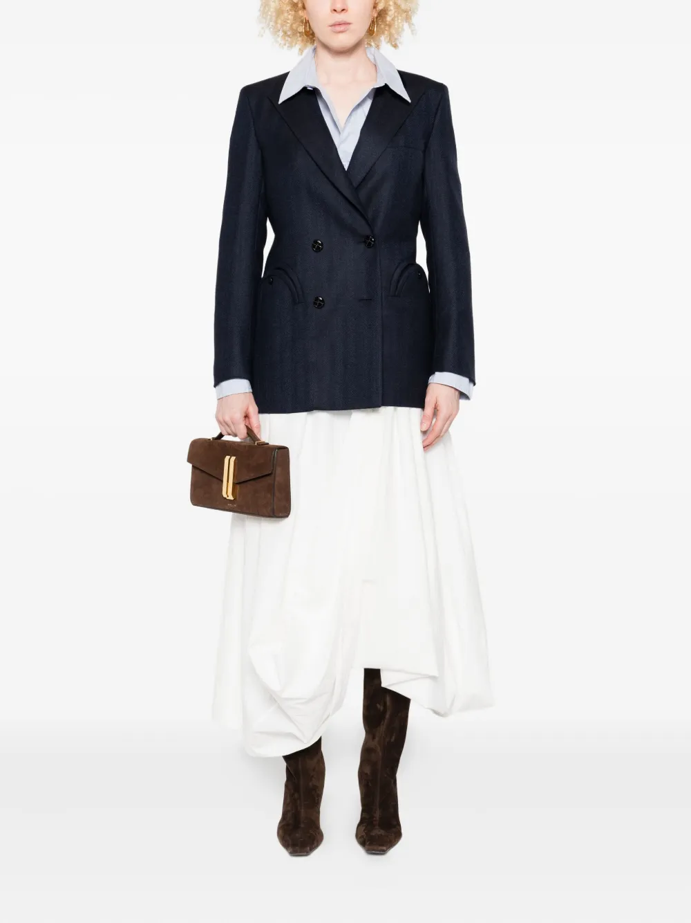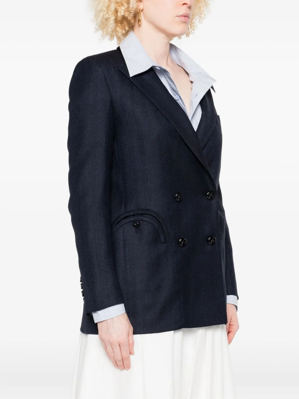 Двубортный шерстяной пиджак темно-синего цвета с отделкой, воротником, закругленными карманами и застежкой на пуговицы.