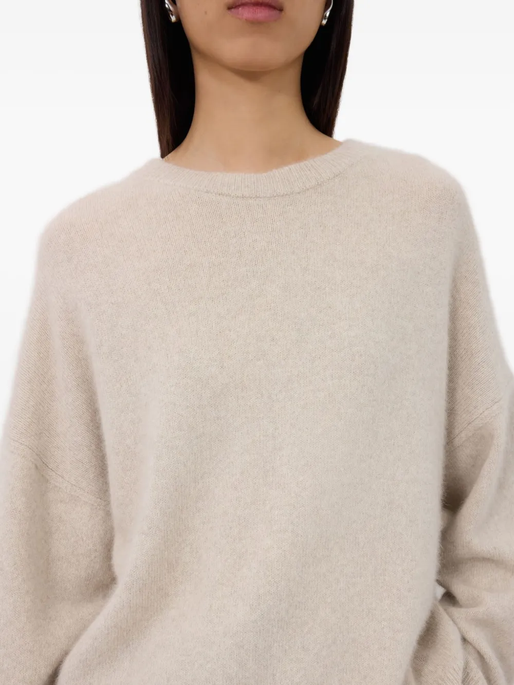 Бежевый круглый вырез, спущенные плечи, ребристые манжеты и подол.