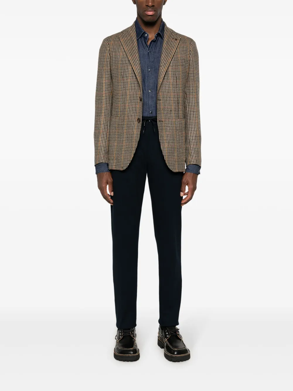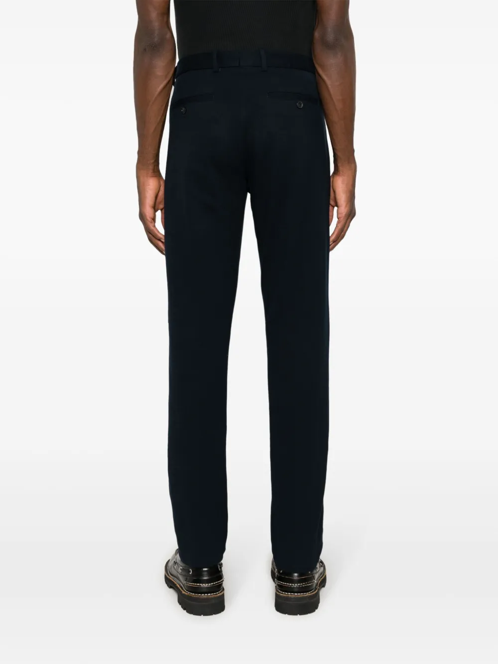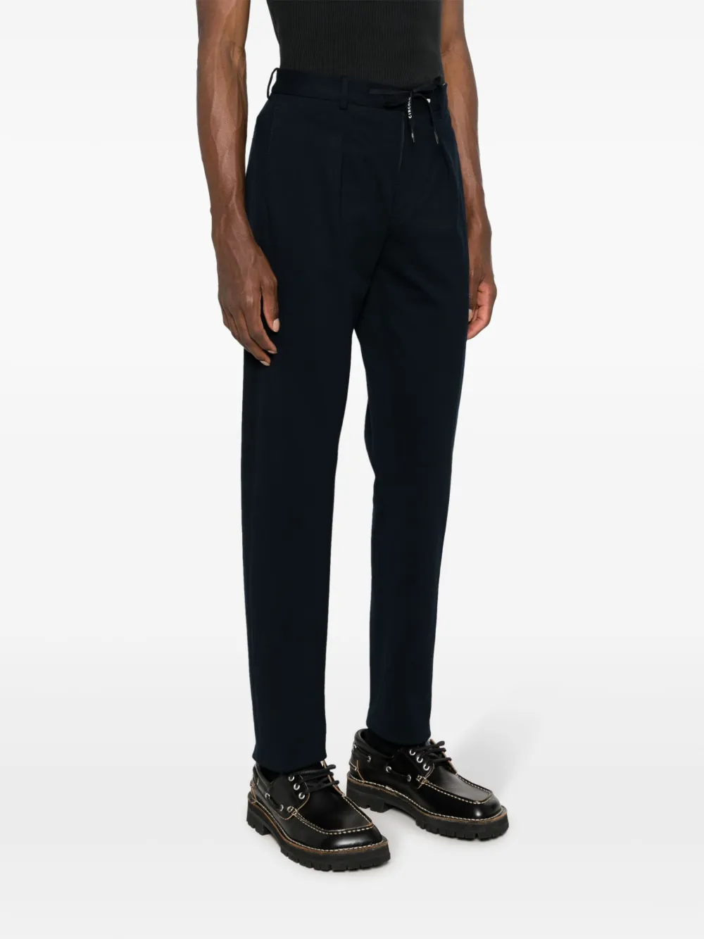 Темно-синий, смесовый хлопок, эластичный хлопок, стрелки, встречная складка, ремешки с логотипом, кулиска на талии, застежка на молнии и пуговице спереди, два вшитых кармана по бокам, два кармана с листочкой сзади и зауженный крой.