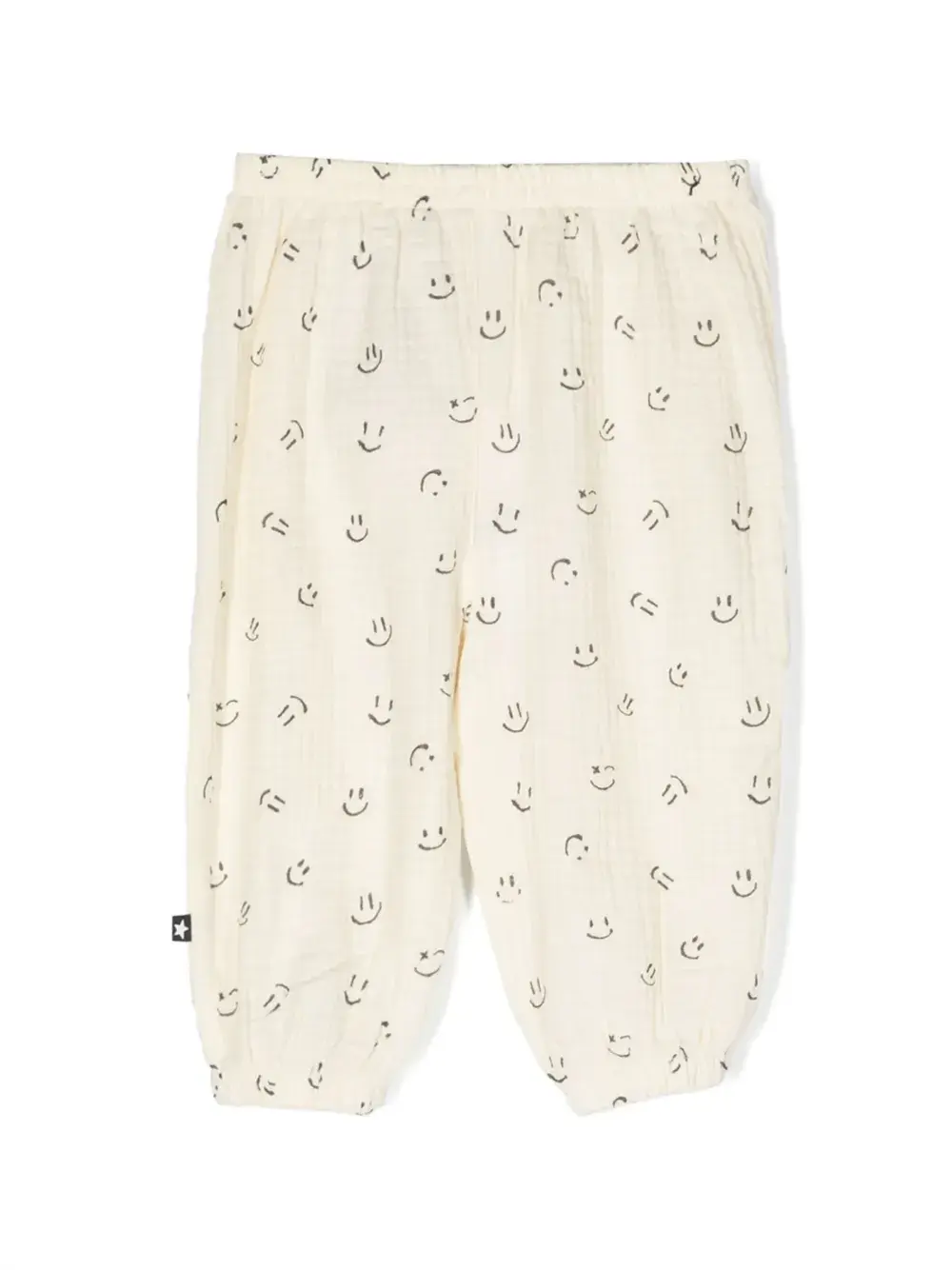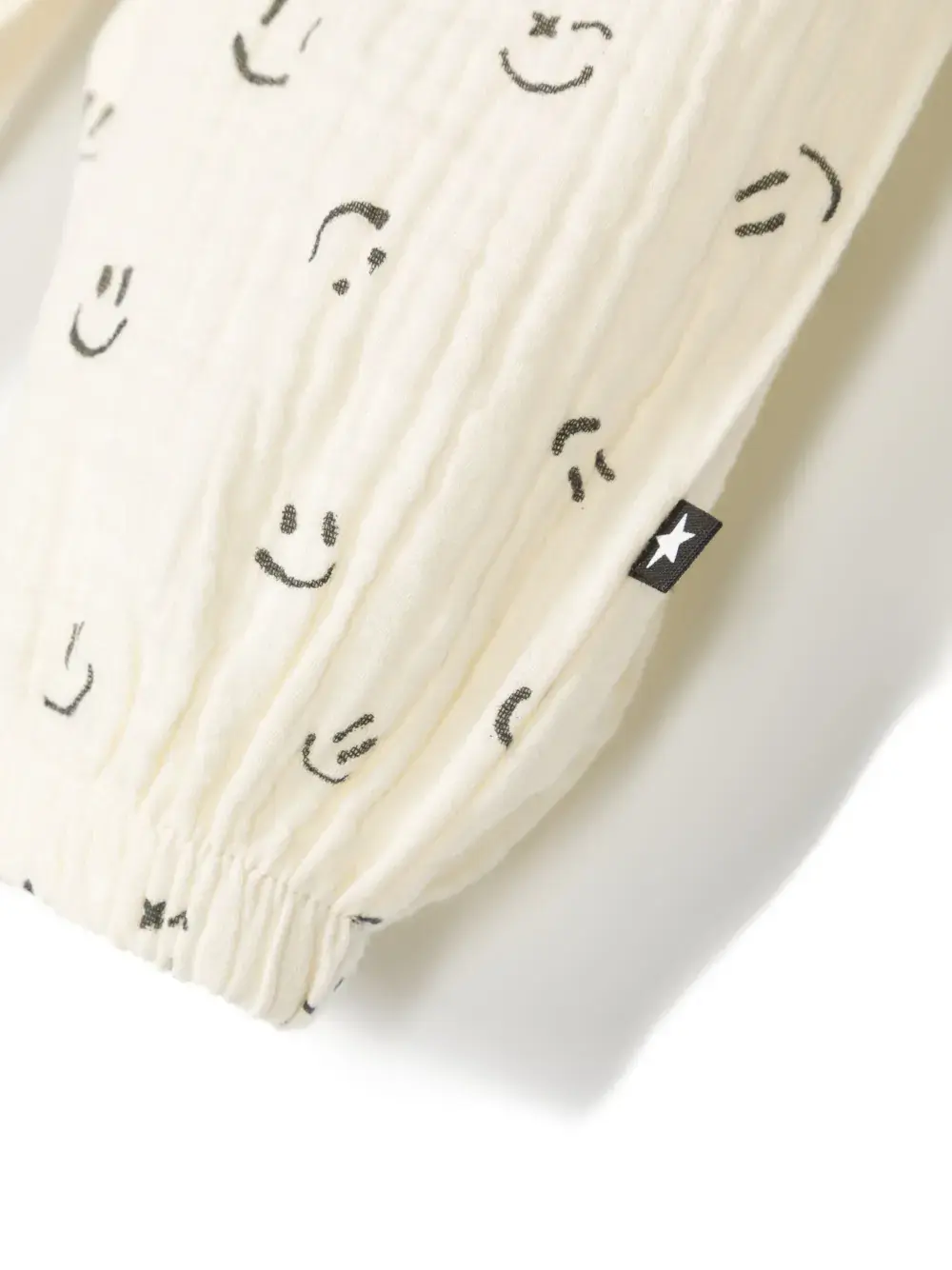 Кремово-белый, хлопок, принт с изображением смайла, маленькая подвеска с логотипом, эластичный пояс и эластичные манжеты. Узнать больше о том, какие товары получают отметку «Ответственный выбор», можно из материала «Как мы оцениваем экологичность и этичность».