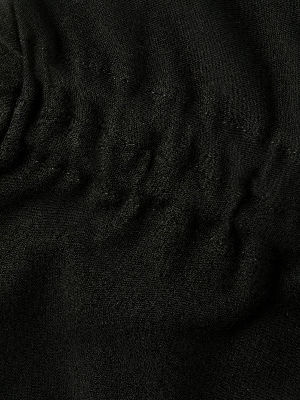 Черный, хлопок, вырезные детали, круглый вырез, короткие рукава, присборенный лиф, приталенный силуэт, подол с кулиской и длина до бедер.