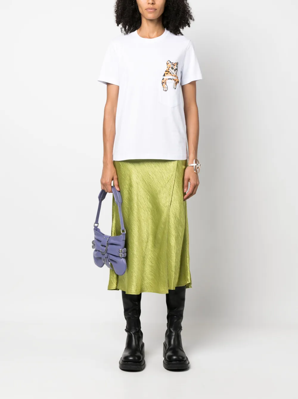 Серовато-белый, хлопок, анималистичный принт, декор из бисера, принт с логотипом сзади, круглый вырез, короткие рукава, нагрудный накладной карман и прямой подол.