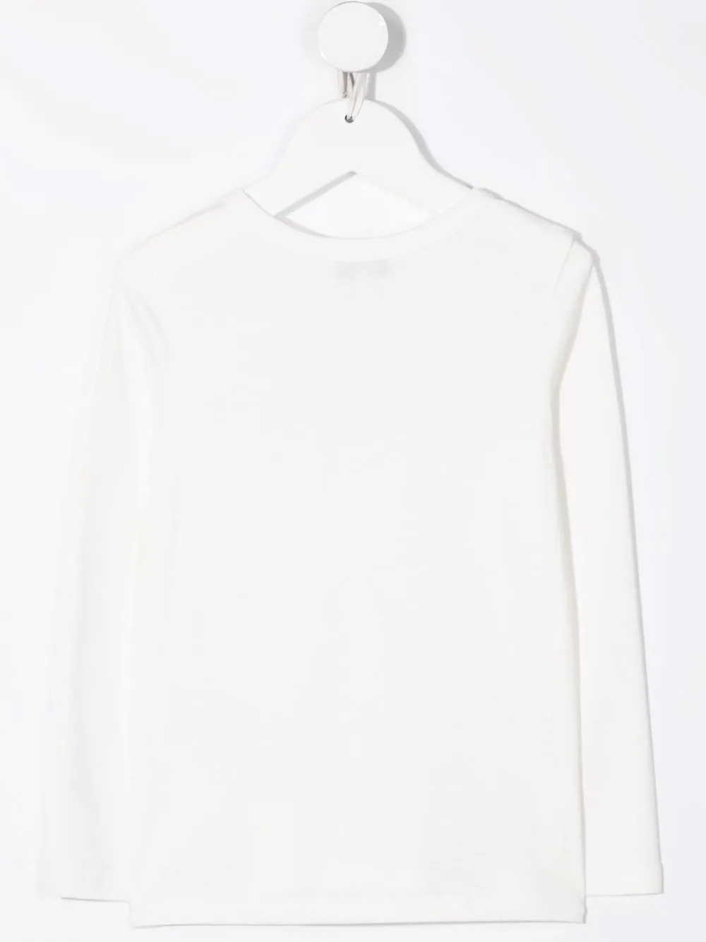 Принт с логотипом на груди, круглый вырез, длинные рукава и прямой подол. Цвет: белый.