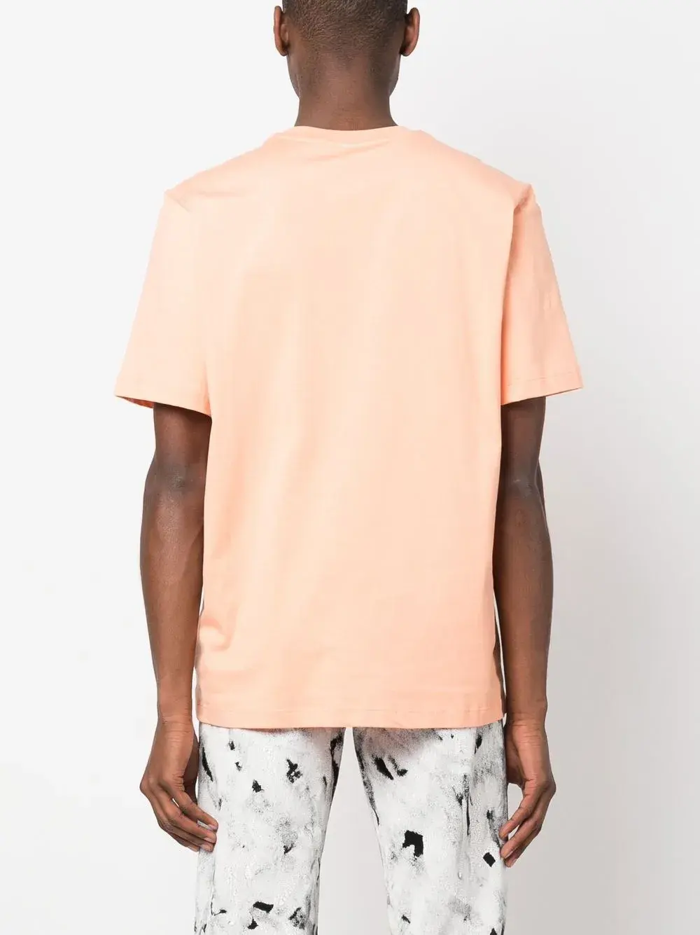 Персиково-оранжевый, хлопок, ткань джерси, логотип спереди, круглый вырез, короткие рукава и прямой подол.