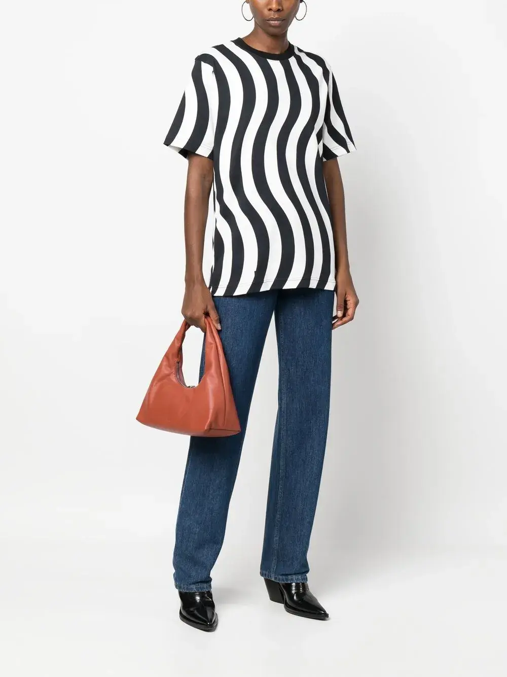 Черный/белый, хлопок, волнистый принт, круглый вырез, короткие рукава и прямой подол. Это унисекс-модель. Обратите внимание, что для нее используется мужская размерная сетка. Узнать больше о том, какие товары получают отметку «Ответственный выбор», можно из материала «Как мы оцениваем экологичность и этичность».