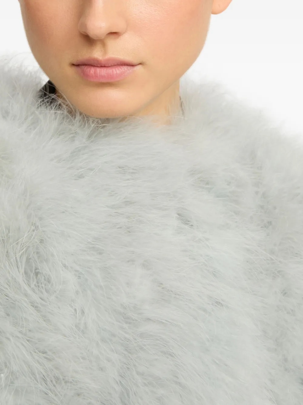 Серые перья индейки, круглый вырез, рукава три четверти, застёжка на крючок. Изделие отличается очень деликатной отделкой. Обращайтесь с ним крайне осторожно, чтобы избежать повреждений, таких как поломка перьев или потеря пайеток.