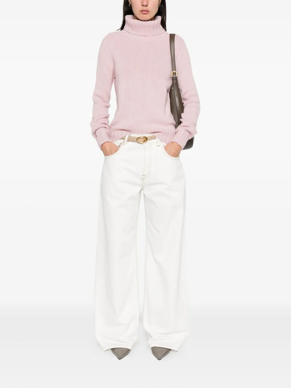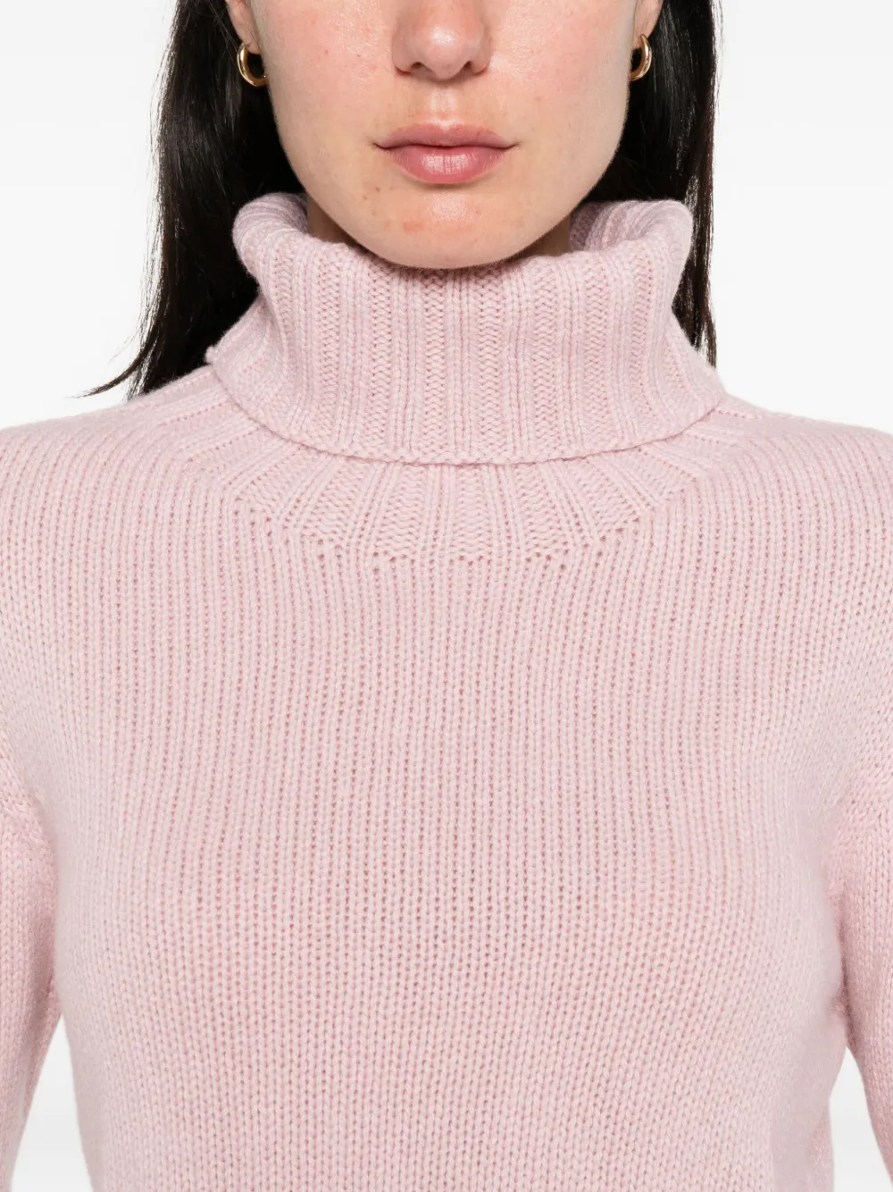 Водолазка из розового кашемира, длинные рукава, ребристые манжеты, ребристый подол.