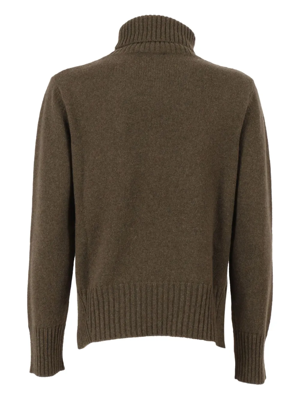 Коричневая водолазка с ребристым подолом, длинными рукавами и ребристыми манжетами.