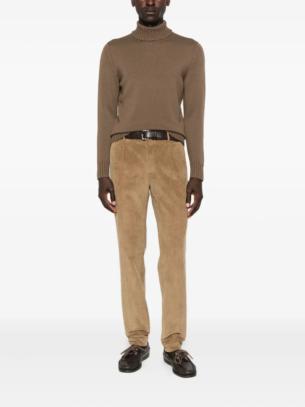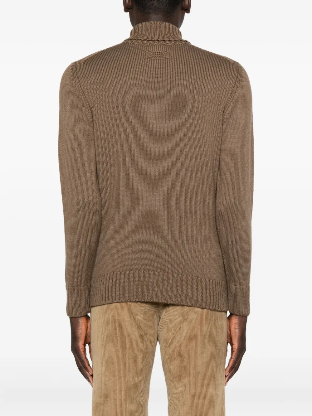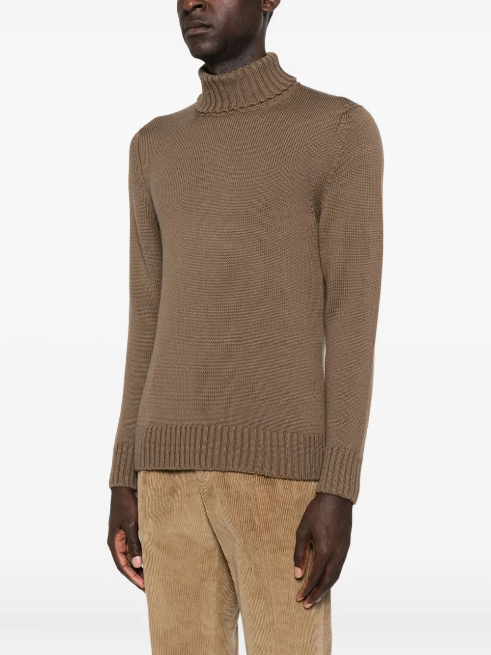 Коричневая водолазка с длинными рукавами, ребристыми манжетами и ребристым подолом.
