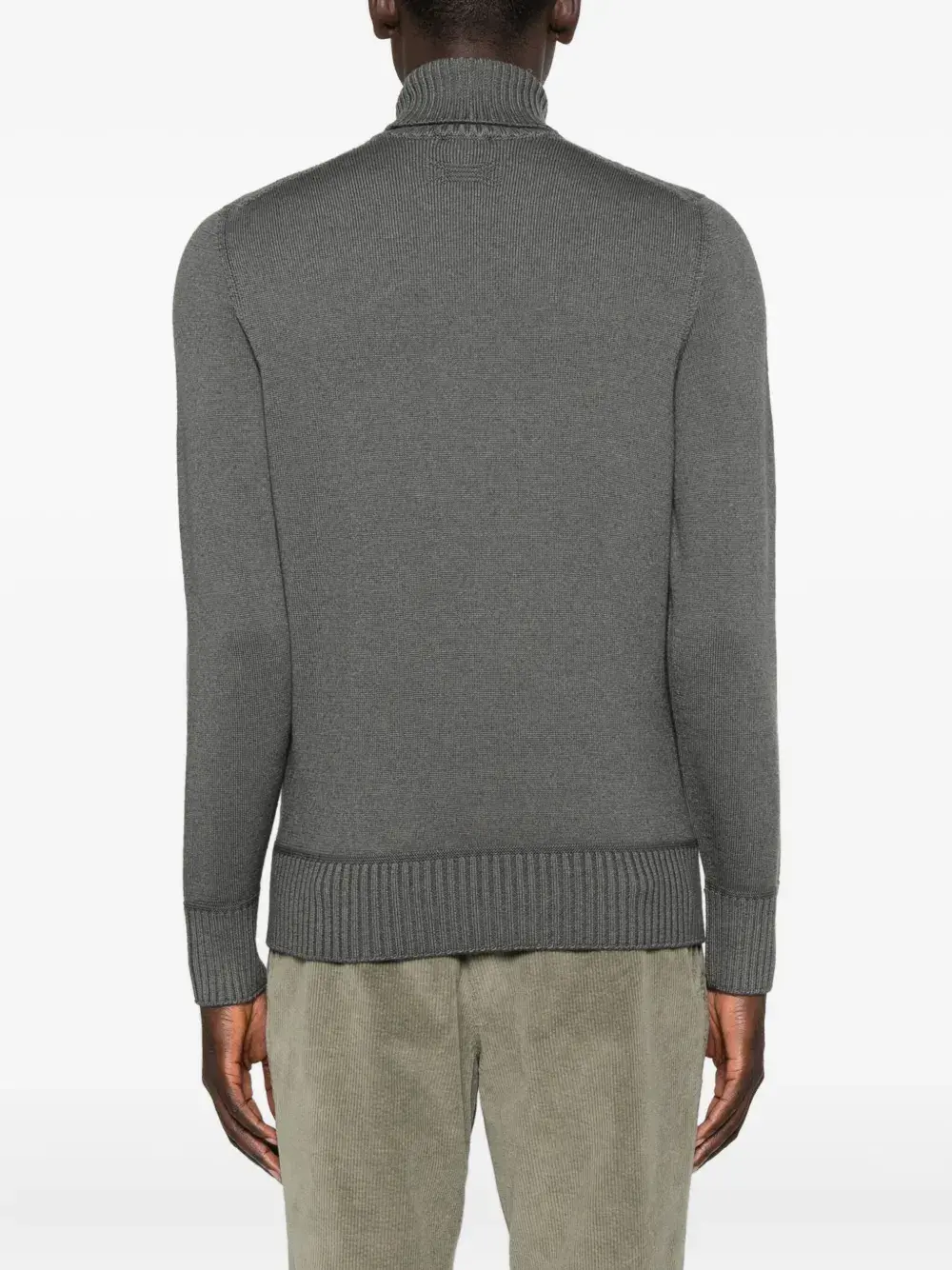 Темно-серая водолазка с длинными рукавами, ребристыми манжетами и ребристым подолом.