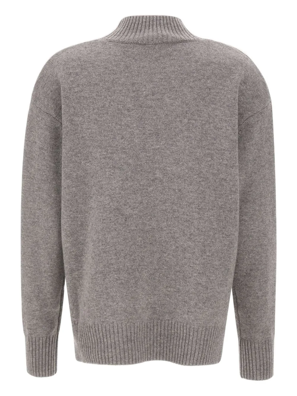Серая водолазка с ребристым подолом, ребристыми манжетами и длинными рукавами.