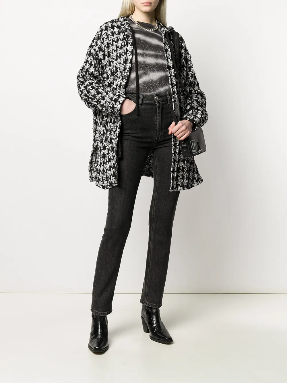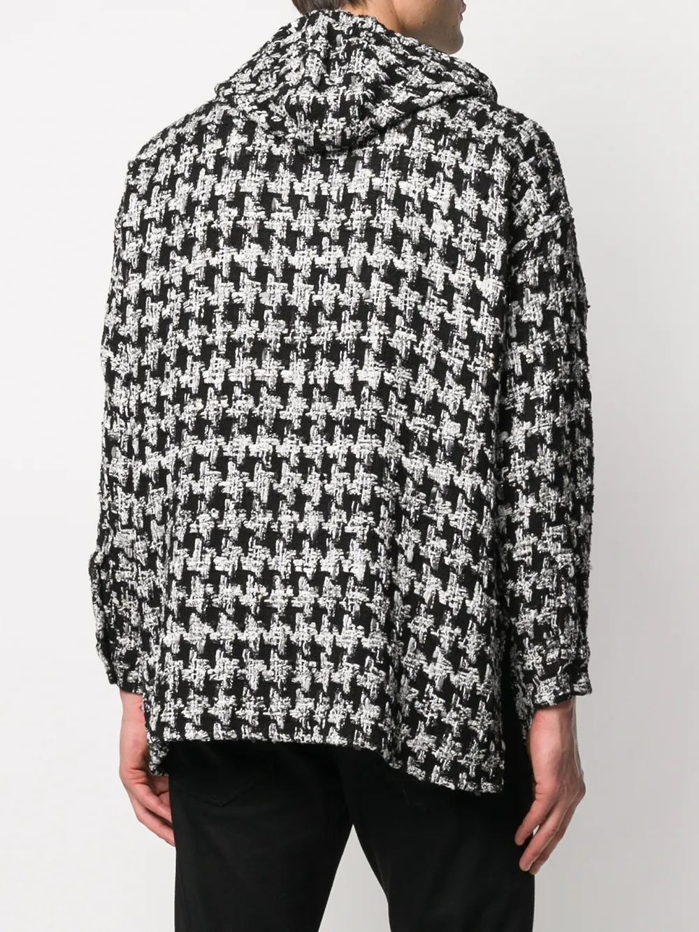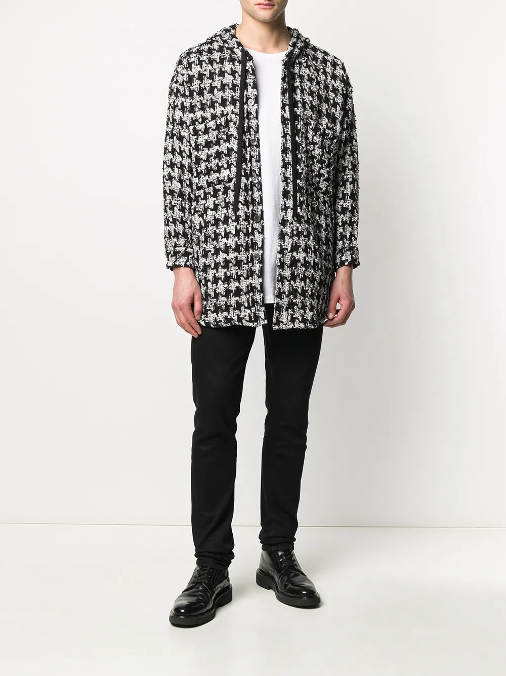 Твидовая куртка с капюшоном от Faith Connexion. Узор в ломаную клетку, капюшон на шнурке, застежка на пуговицах спереди, свободный крой, разрезы по бокам, приспущенные плечи, длинные рукава и манжеты на пуговицах.