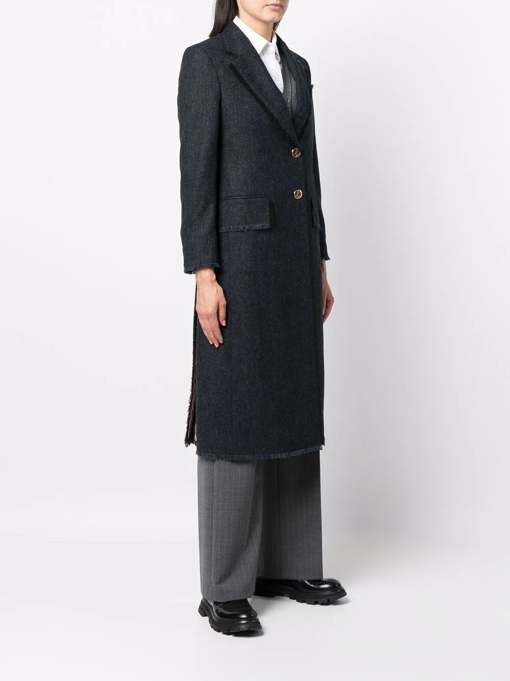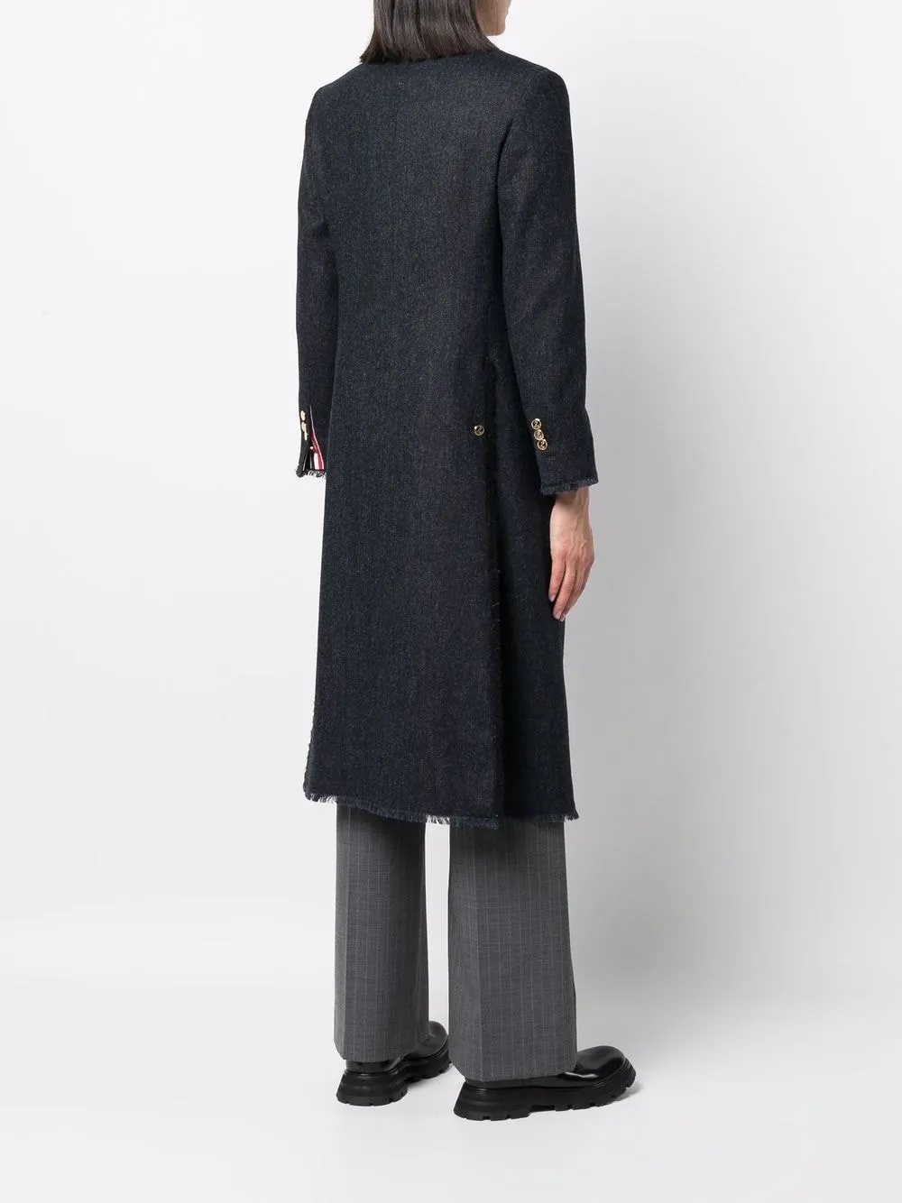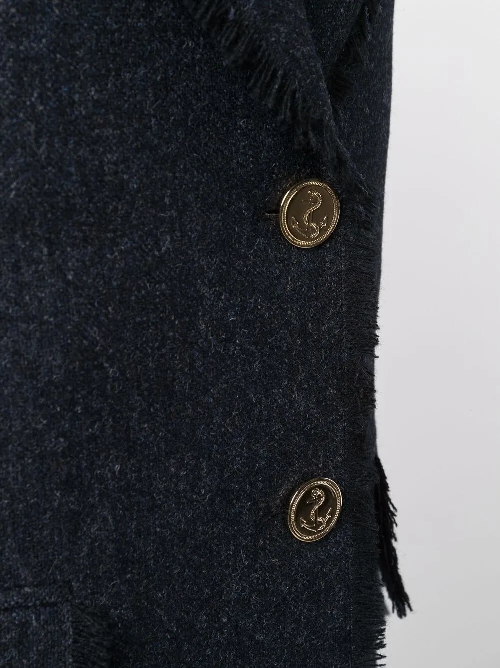 Темно-синий, шерсть, твидовая ткань, зазубренные лацканы, застежка на пуговицах спереди, прорезной карман на груди, два кармана с клапанами по бокам, необработанные края, необработанные края, манжеты на пуговицах и длина миди.