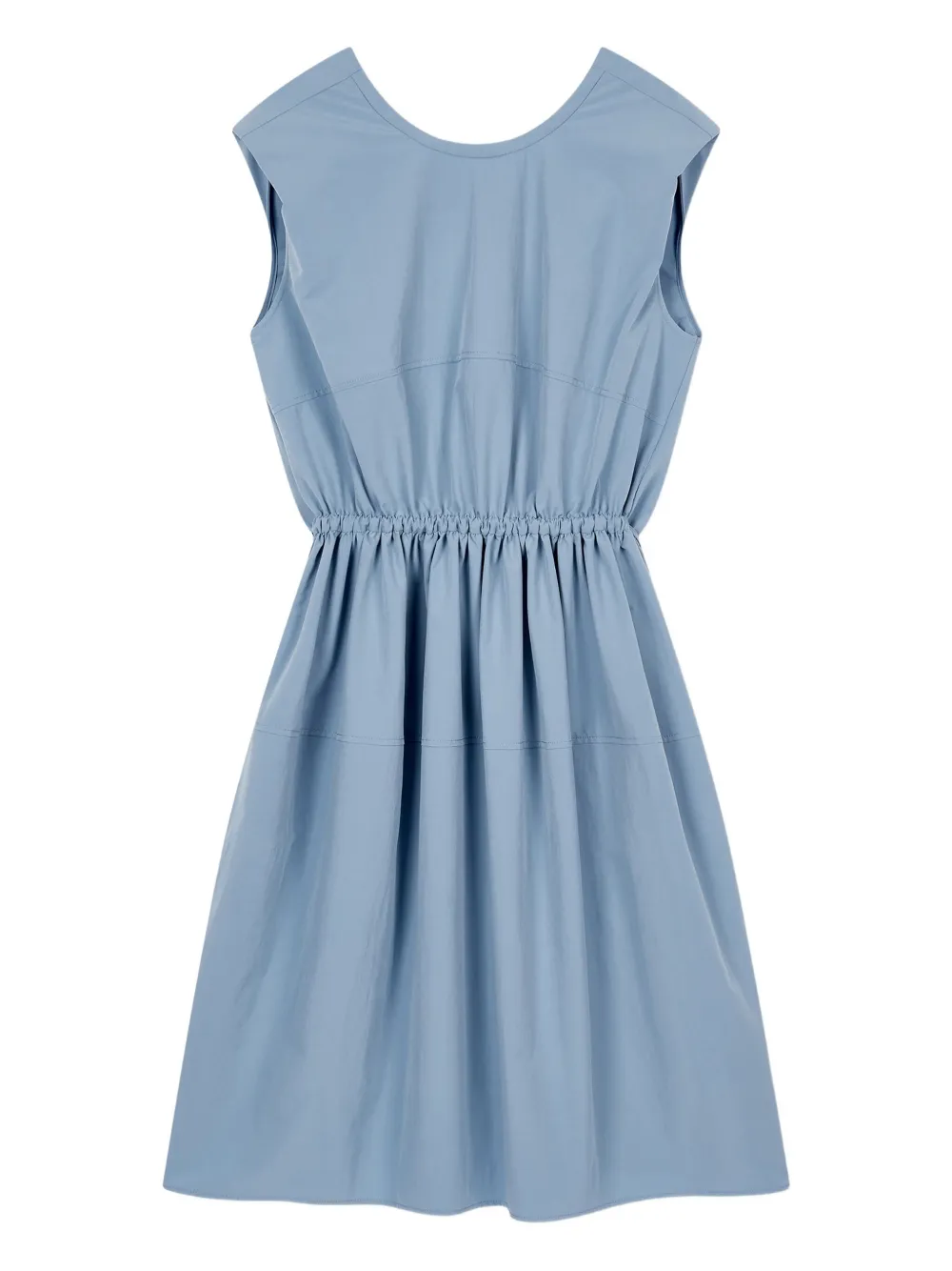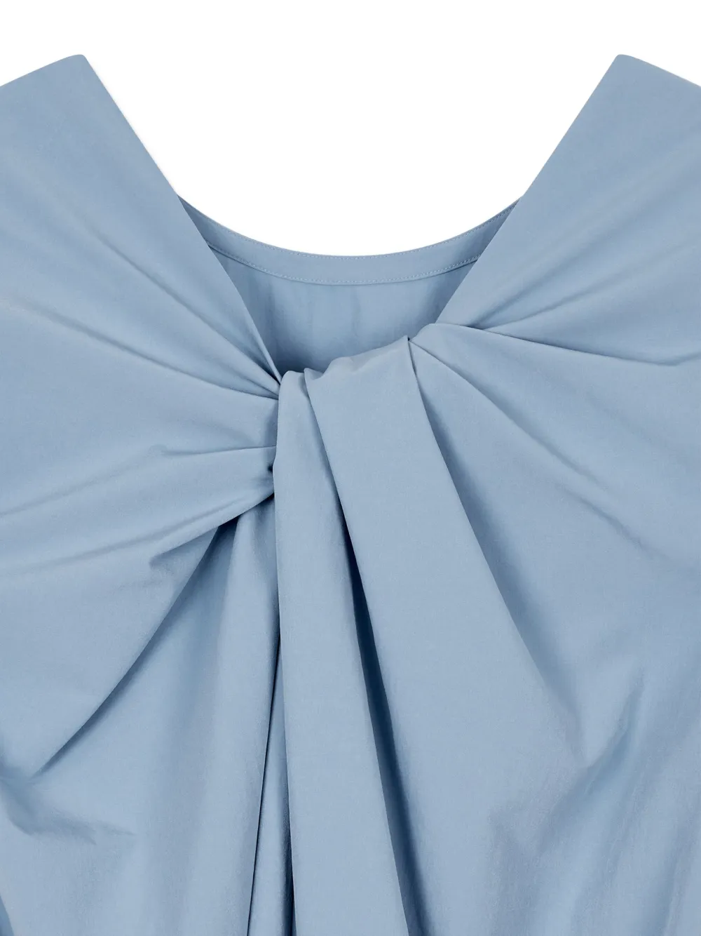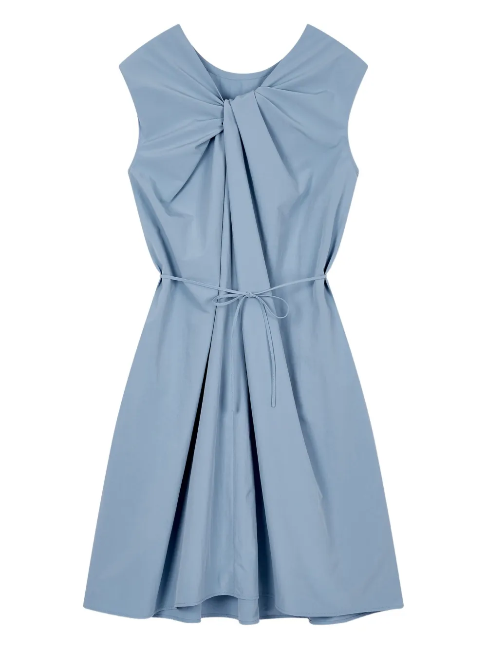 Темно-синяя юбка А-силуэта с круглым вырезом, без рукавов, с присборенной талией и перекрученным вырезом.