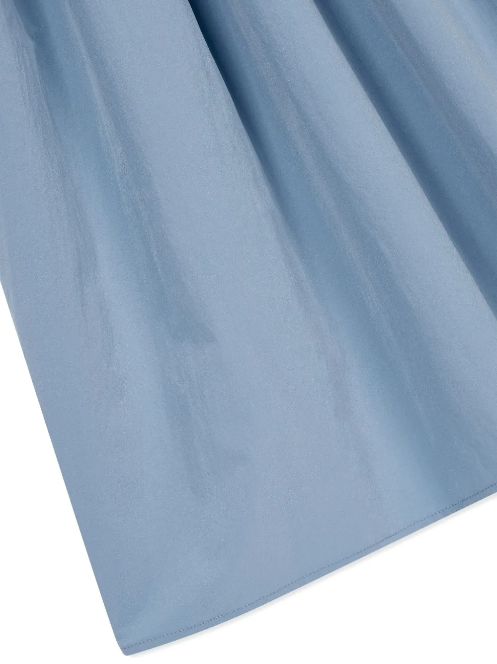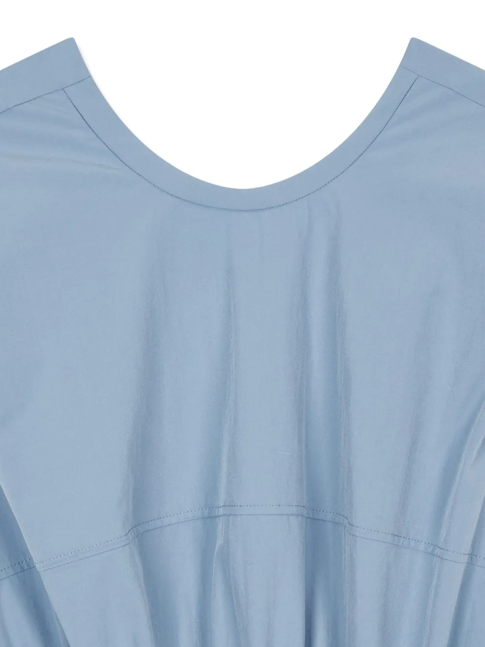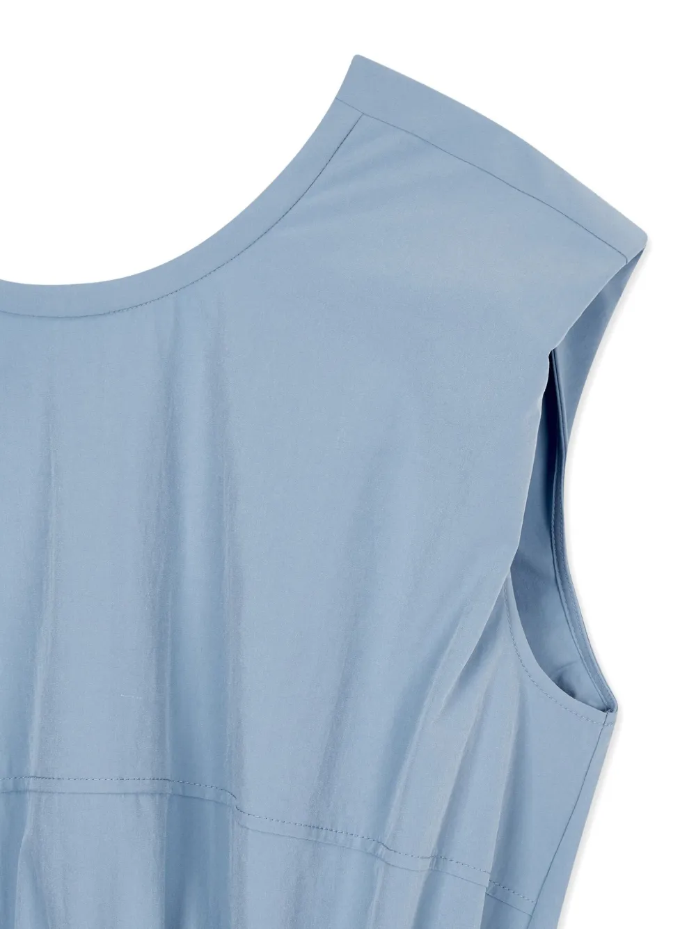 Темно-синяя юбка А-силуэта с круглым вырезом, без рукавов, с присборенной талией и перекрученным вырезом.
