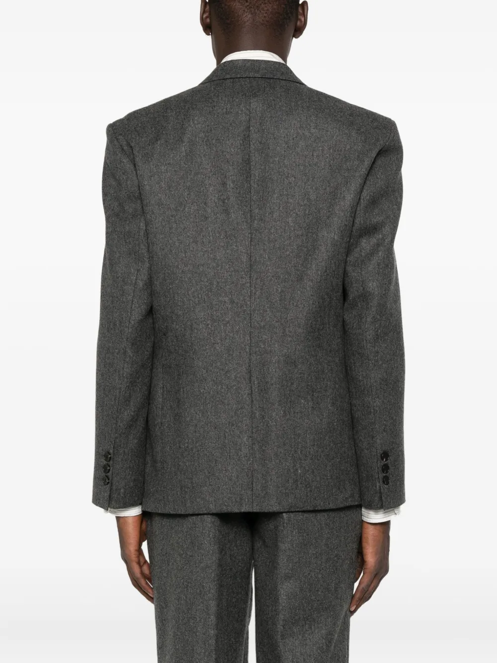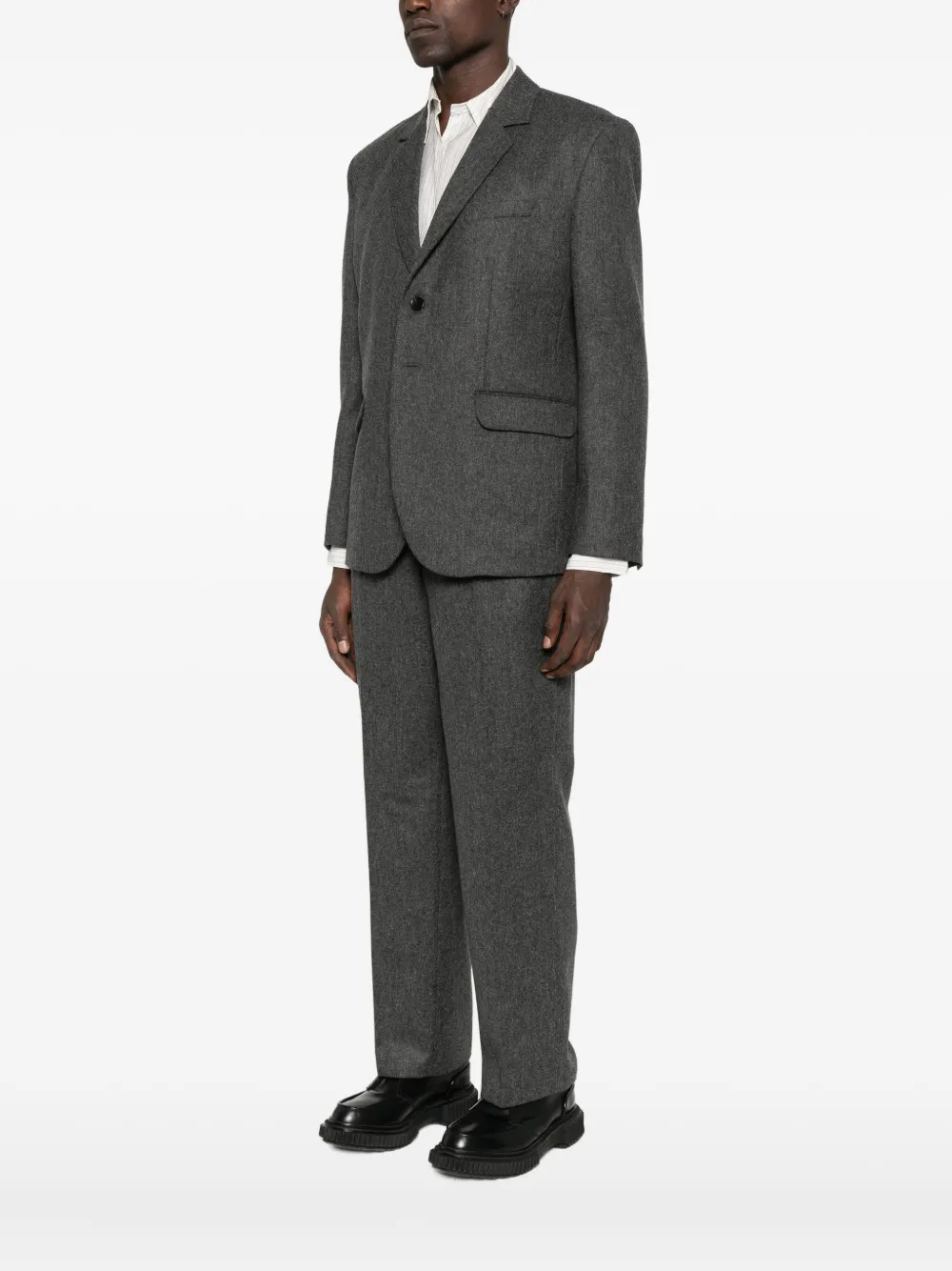 Серый, застежка на две пуговицы, прорезные лацканы, прорезные карманы, прямой подол.