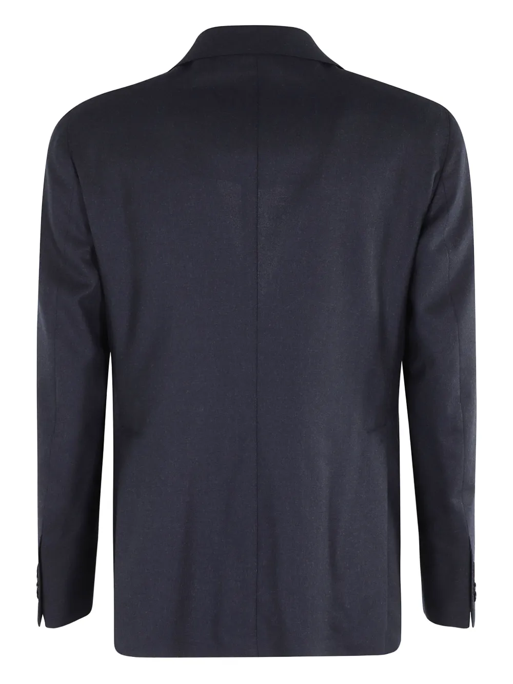 Темно-синяя застежка на две пуговицы, отложные лацканы, боковые карманы, прорезные карманы.