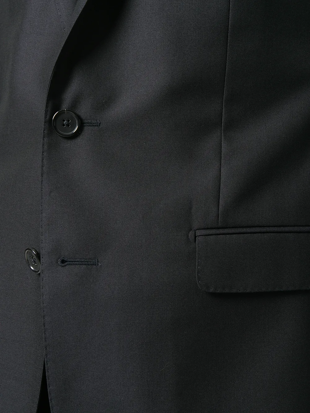 Черный костюм-двойка из шерсти и шелка от Dolce & Gabbana(Дольче Габбана). Заостренные лацканы, застежка на пуговицах спереди, длинные рукава, манжеты на пуговицах, нагрудный карман, передние карманы с клапанами, пояс с петлями для ремня, потайная застежка спереди, боковые карманы по шву, задние карманы с листочкой на пуговицах, узкий крой.