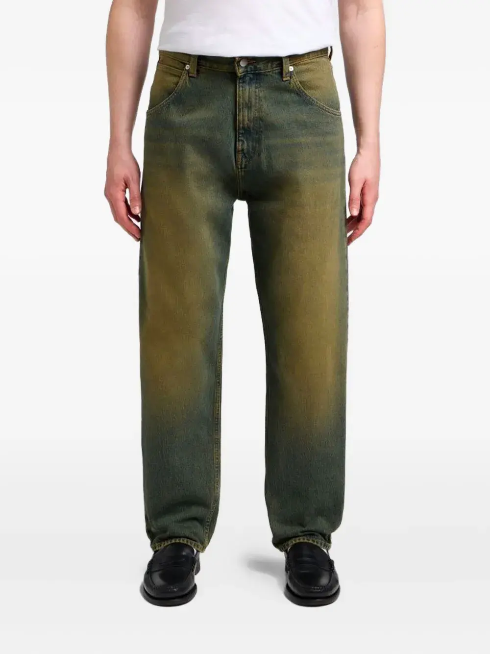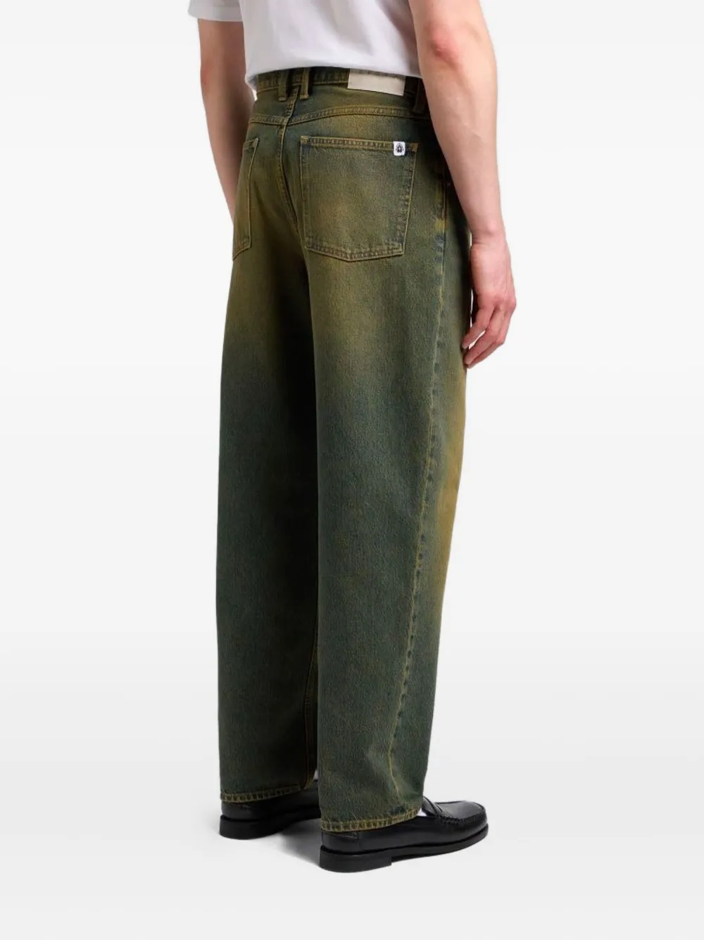 Сине-зеленая потертая модель с пятью карманами, застежкой на пуговицы и высокой талией
