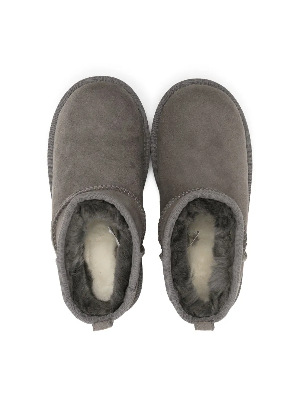 Серый, овечья кожа, водоотталкивающее покрытие, закругленный носок, петля для подтягивания сзади, модель без застежки, высота по щиколотку, подкладка из овечьей шерсти и рифленая резиновая подошва.