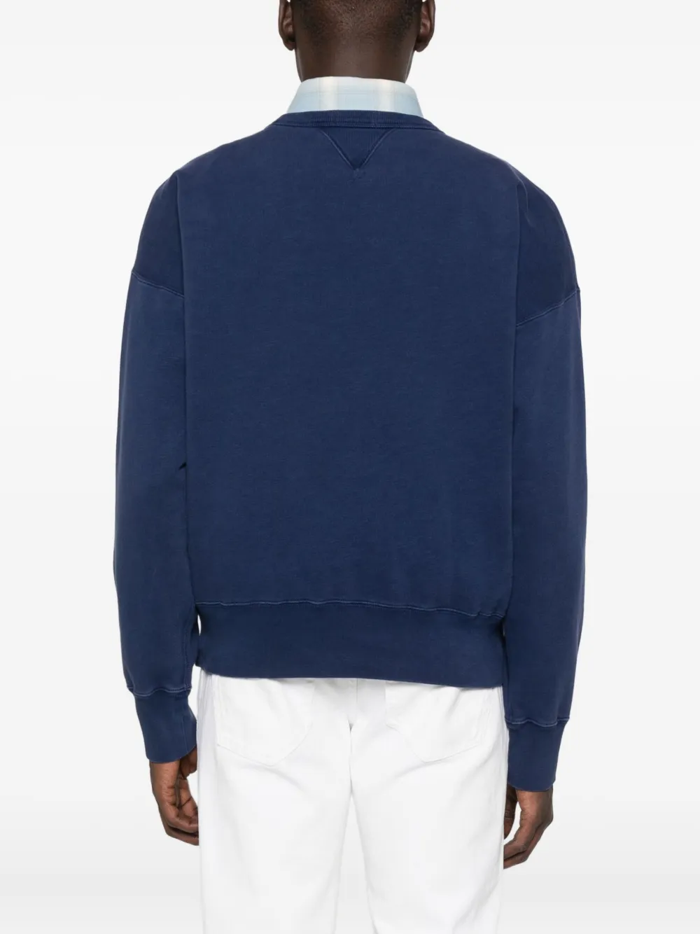 Темно-синий круглый вырез горловины, длинные рукава, аппликация с надписью