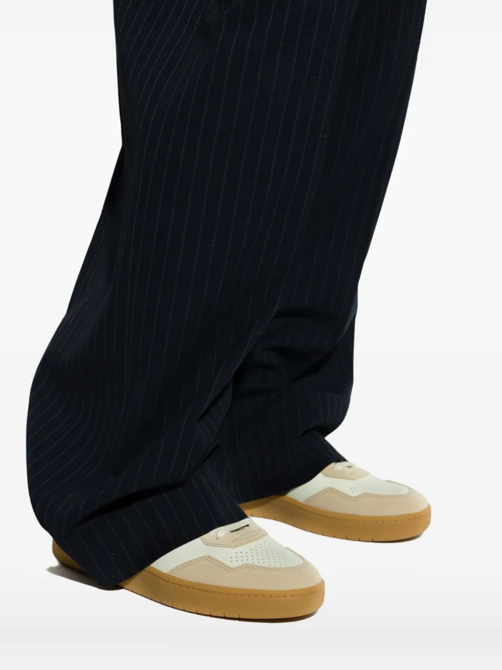 Верх из светло-белой кожи, замшевая вставка на пятке, перфорированная отделка, зеленый логотип V, плоская резиновая подошва