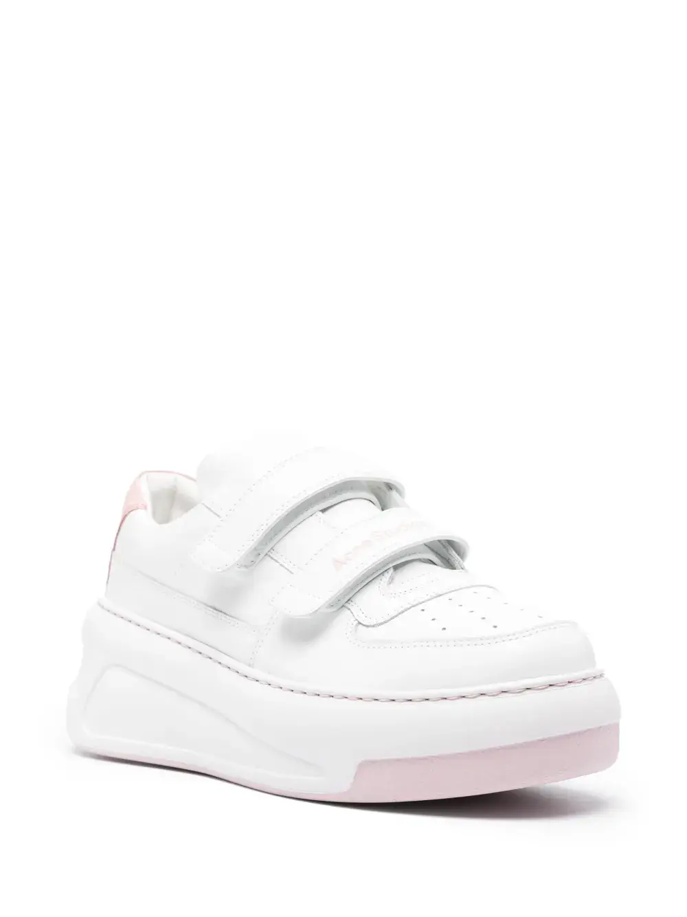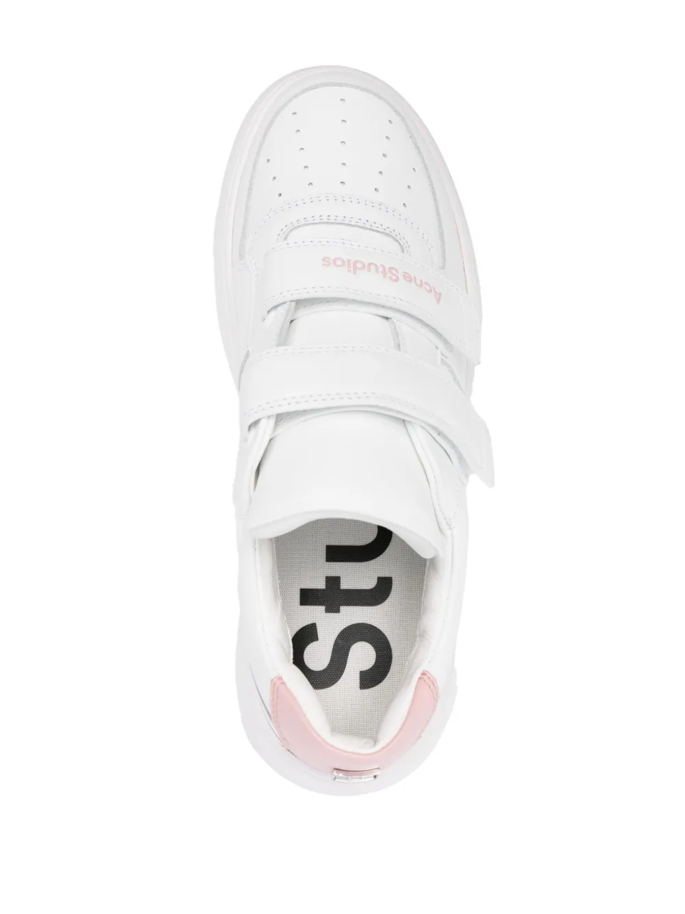 Подробнее о товаре: • белый/светло-розовый • телячья кожа • гладкая текстура кожи • застежка на липучке спереди • металлический декор с изображением смайла • контрастный задник • уплотненная щиколотка • тисненый логотип спереди • перфорированный носок • закругленный носок • стелька с логотипом • подошва на платформе • массивная резиновая подошва • В комплект входит мешок-пыльник для хранения.