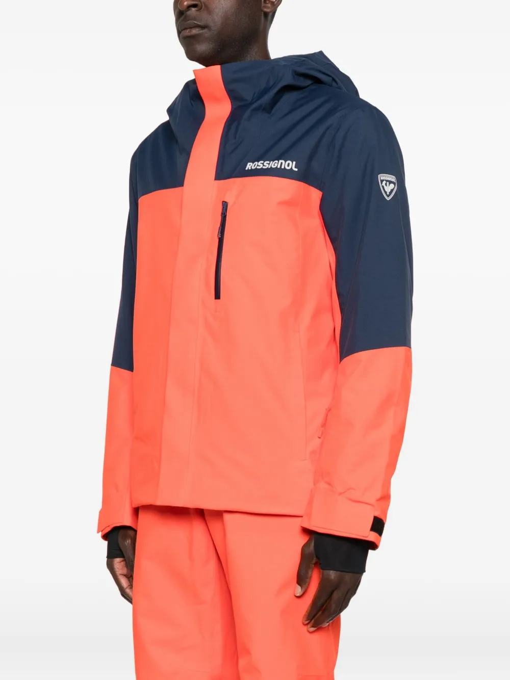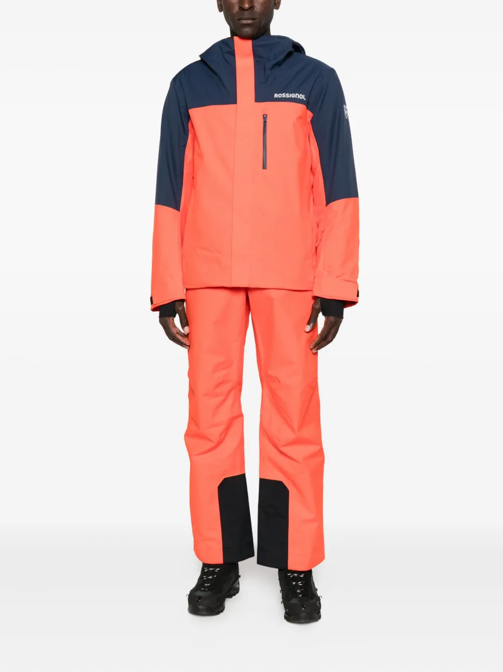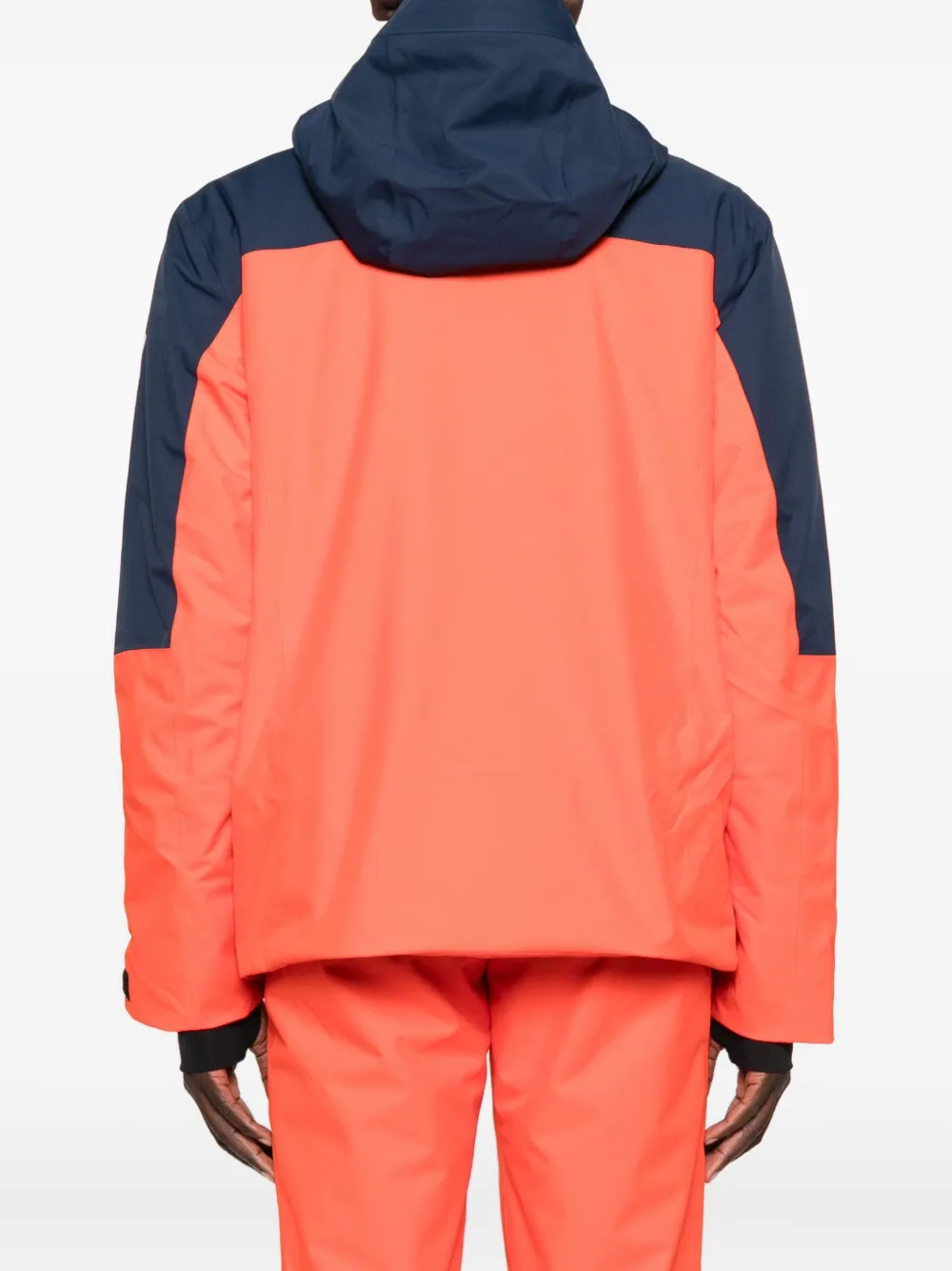 Оранжево-голубые панели, застежка-молния, длинные рукава, прорезные карманы, снежная юбка, принт с логотипом, застежка на шнурки.