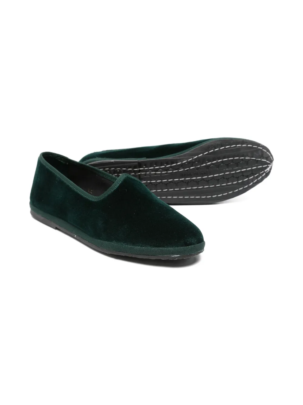 Верх из темно-зеленого бархата, плоская подошва, резиновая подошва.